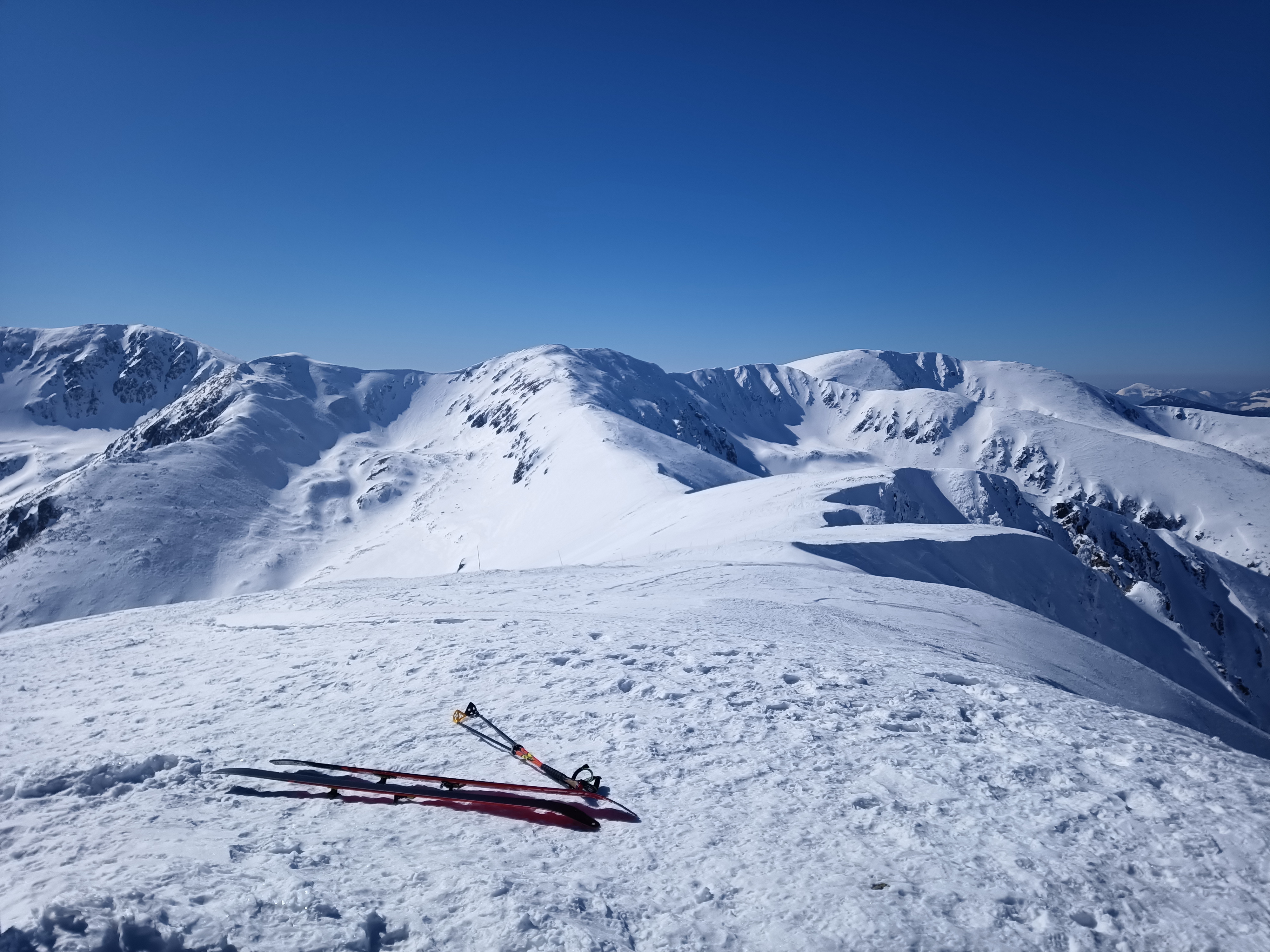Na chate konečne teplá polievka, teplý čaj a veľká káva. Obúvam suché ponožky, trochu sa ponaťahujem a vyrážam smer Ďumbier. Ľudí tu vzhľadom na pondelok nie je veľa, ale po západnej časti hrebeňa je to aj tak sociálny šok. Na vrchole sa nezdržiavam, pokochám sa výhľadmi, strhávam pásy a lyžujem smer Demänovské sedlo. Sneh je tu zmrznutý, rozbity, kde tu trčí kameň. Lyžovačka veru dnes nie je veľmi o užívaní si. V sedle lepím pásy a pokračujem smer Chopok. Na Chopku len prefrčím okolo hornej stanice lanovky a púšťam to pod Dereše. Z Derešov krásnym hrebeňom pohodovo na Poľanu a konečne opäť v kľude bez ľudí. Až na ten vietor, ktorý ešte výrazne zosilnel, zalieza už takmer všade a ja začínam byť dosť premrznutý. Rozhodne to nepridáva na pohode. Hrebeň ďalej pokračuje krásnym úsekom cez Kotliská. Opäť rýchlo striedam výšľapy na pásoch a lyžovanie. Pod krátkym, ale výživným výstupom na Chebenec sa mi darí nájsť kúsok závetria za skalou, tak oddychujem. Totálne premrznutý a vyfúkaný volám manželke, na Popradskom plese vraj počasie na krátke tričko. No super. V telefóne mi hovorí, že z Chabenca to už nemám ďaleko a ja som jej naivne uveril – sladká nevedomosť. Posilnený touto info cikcakujem na Chabenec.