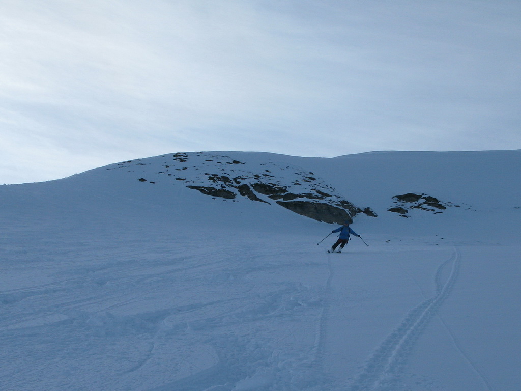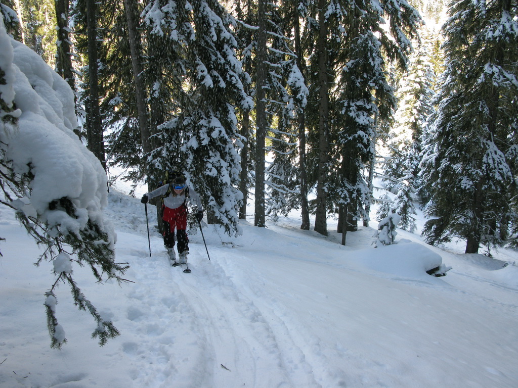 Do zjazdu sa púšťame až okolo pol štvrtej. Hore kúsok kôrka, ale potom už nekonečný prašan...