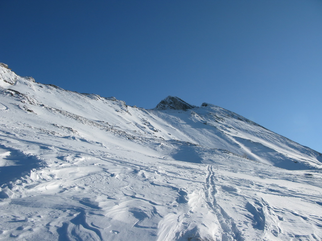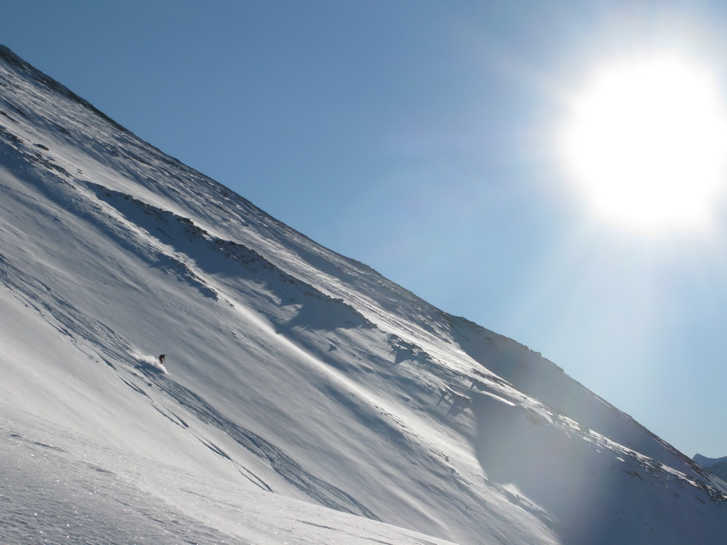 Hore šliapeme po červenej zjazdovke, strmú čiernu si necháme na zjazd. Na konci 1000 v.m. šliapania sa necháme prehovoriť pekne natiahnutou stopou vedúcou pod vrchol Graukogelu. Stopa končí na vyfúkanom hrebeni, ešte kus od vrcholu. Prašanom nabitý žľab sľubuje predsa len iný zážitok ako zjazdovka, pod ním ešte pekný kúsok prašanu pomedzi stromčeky, kým sa pripojíme na čiernu zjazdovku.
