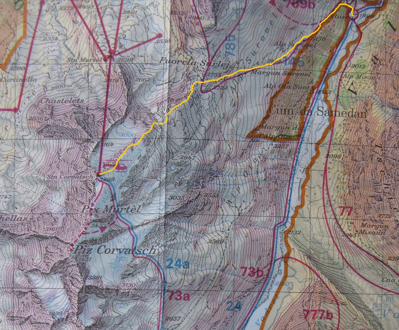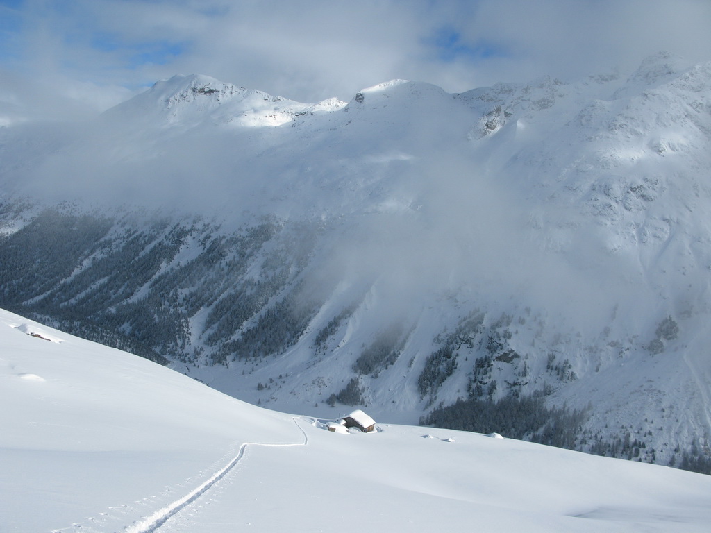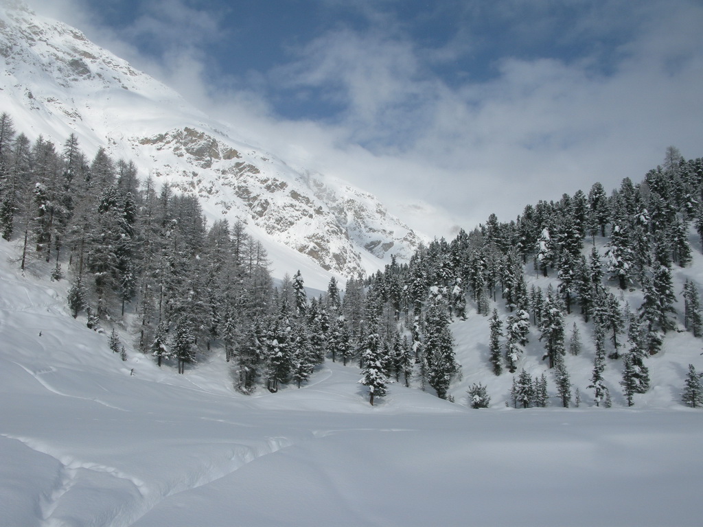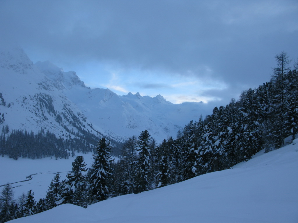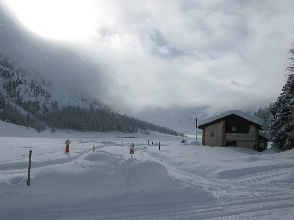 Dolina Val Roseg ponúka pre skialpinistov hlavne vážnejšie ciele až v období stabilnejšej snehovej pokrývky, čiže v druhej polovici zimy. V januári tohto roku, keď sneží takmer každý deň, sa však dá tiež niečo podniknúť. Takou najvďačnejšou túrou do týchto podmienok, keď je všade kopec čerstvého snehu, je stúpanie do sedla Fuorcla Surlej od hotela Roseggletscher. Tu sa nachádza lyžiarska chata, okolo ktorej ide zjazdovka. Tu sa už môžete napojiť na zjazdovku lyžiarskeho strediska Corvatsch a po jej okraji si vyšliapať k vrcholovej stanici lanovky (3300 m).