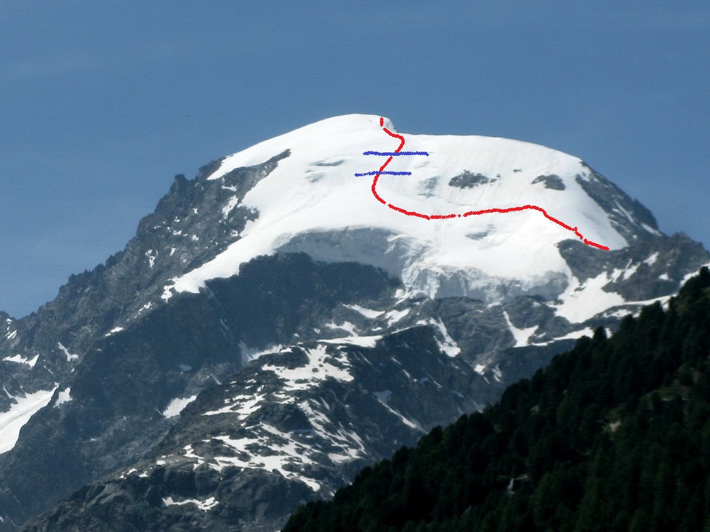 Výstup od chaty Boval 2495m. od ľadovca Morteratsch je možný ale je strmší, zložitejší a nebezpečnejší.