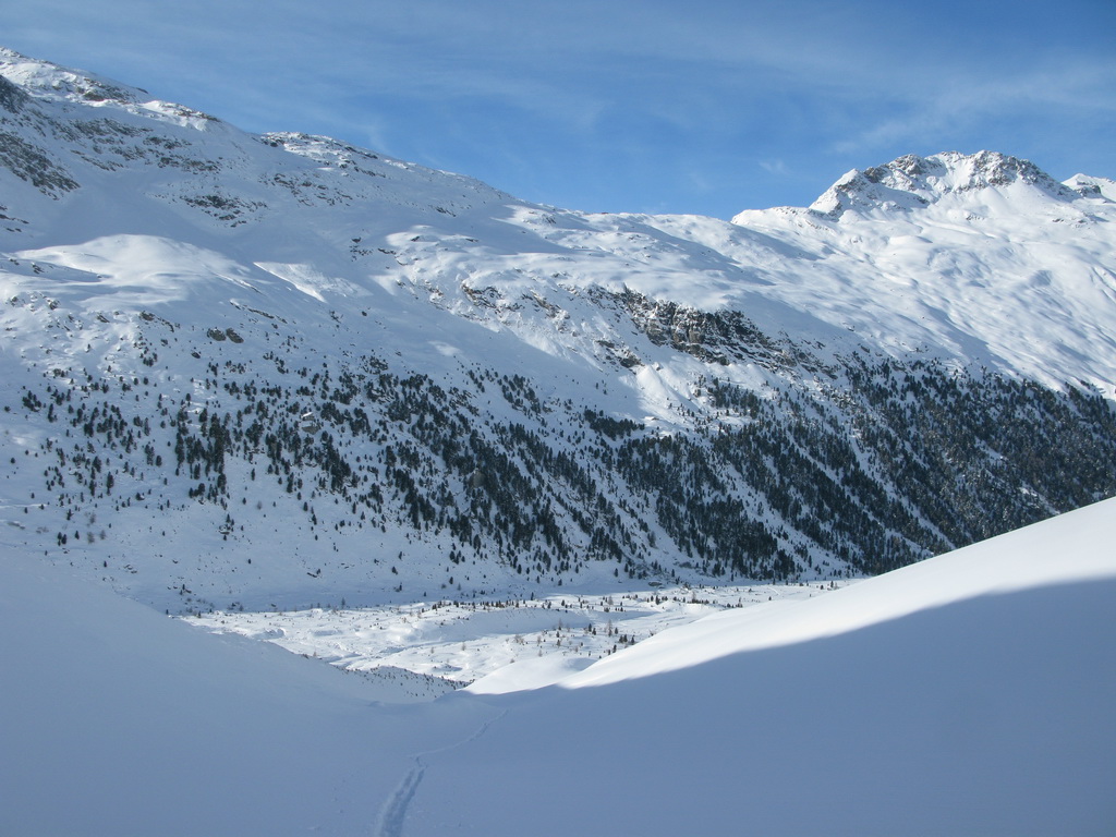 Prichádzam ku lyžiam, s lyžami v rukách zbehnem strmšiu časť svahu. Dám si dole mačky a rovno si pripínam lyže aj s pásmi. Spúšťam sa dole svahom na pásoch a traverzujem k úpätiu Piz Tschierva .