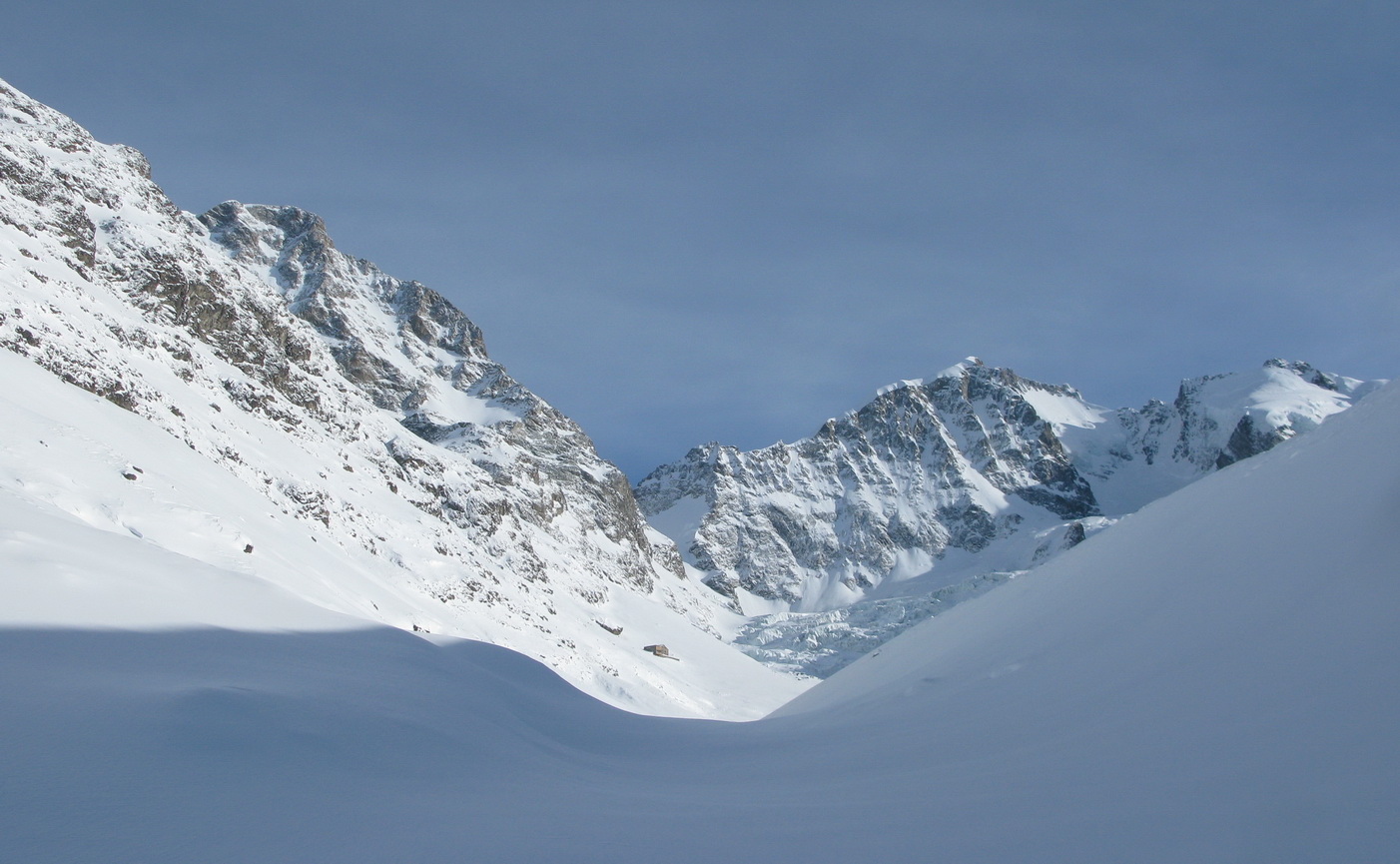 Ďalej výstup pokračuje dolinkou na úpätí Piz Tschierva 3546m. Ľadovcová moréna tu vytvorila akýsi protisvah a tak kráčam hore hlbokou brázdou, ktorá vytvára dokonalú lavínovú pascu. Pred tromi dňami som na obhliadke terénu zistil, že veľké lavíny z úbočia Tschiervy už spadli a ďalšie veľké nebezpečenstvo momentálne nehrozí.