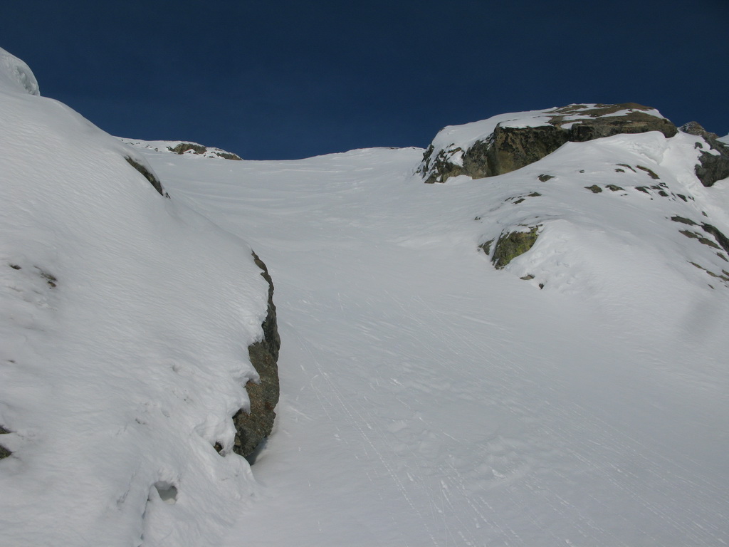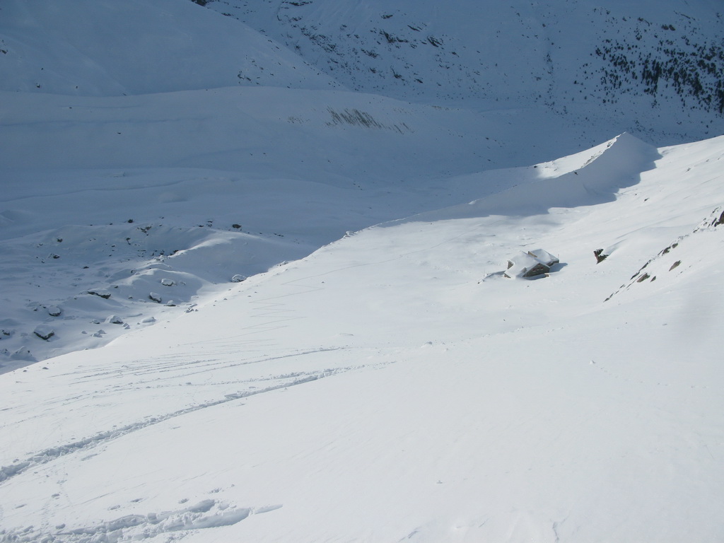 Nad chatou Tschierva prichádzam ku prvému kľúčovému miestu túry: strmé miesto, kde sú v lete reťaze sa prekonáva po zasypanom vodopáde. Chvíľu idem aj peši s lyžami v rukách ale drží to už celkom dobre a tak prechádzam cez lievik ďalej.