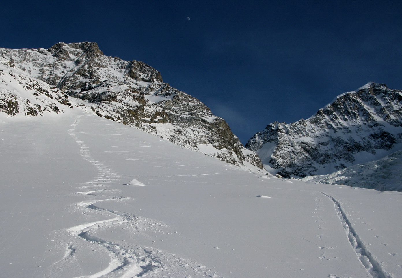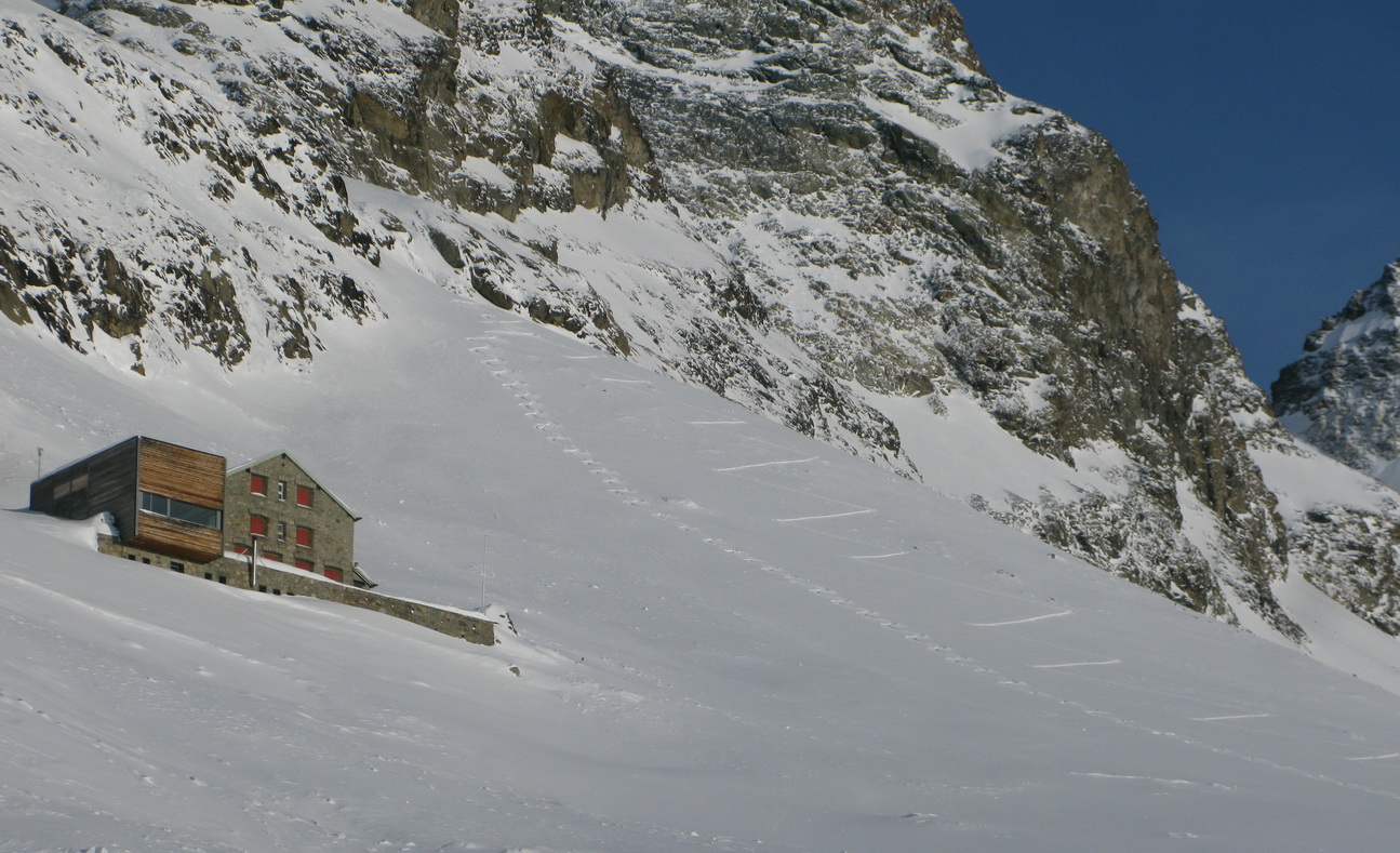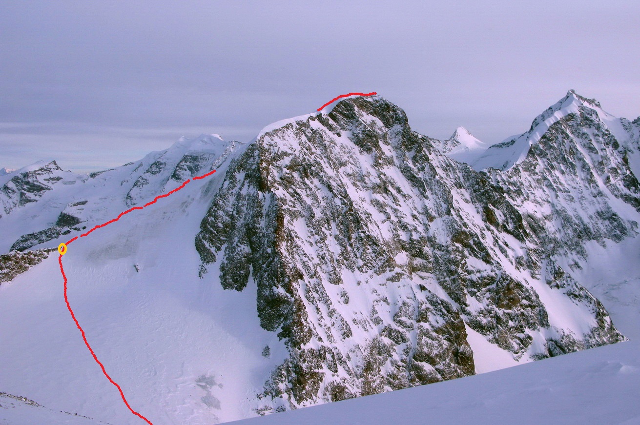 Koncom Januára sa snehová situácia stabilizovala a od posledného veľkého sneženia upokojila. Tri dni pred týmto výstupom som si prešlapal podvečer stopu nad chatu Tschierva 2584m. napriek tomu som v deň výstupu už našiel len občas kúsok stopy, ktorá nebola zafúkaná.
