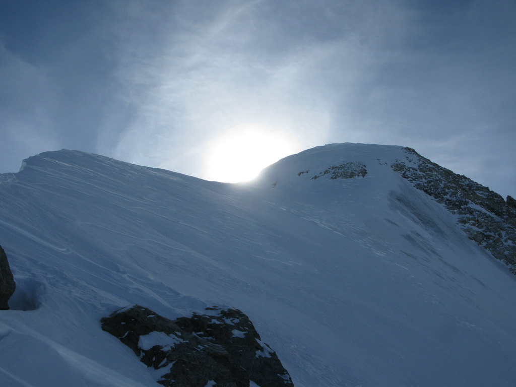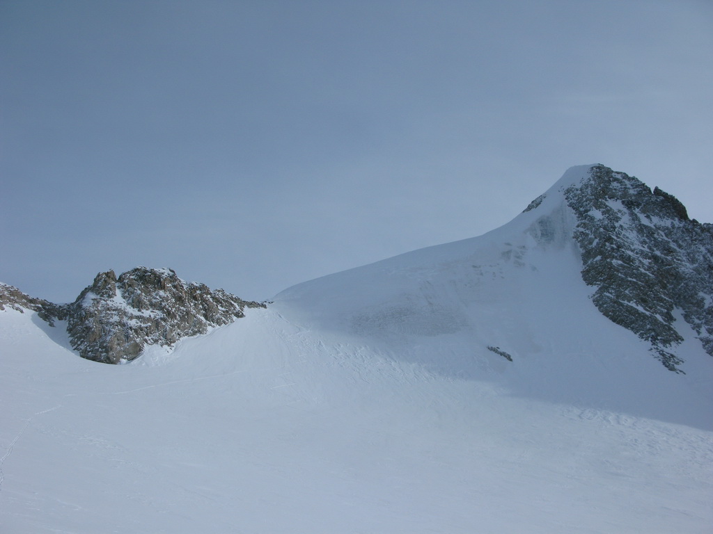Najprv sa nechám zlákať myšlienkou ísť rovno na hrebeň. Svah je stále strmší a tvrdší a tak sa vrátim kúsok dole a traverzujem po ľadovci vľavo. Pamätám si obe možnosti z letného výstupu a to mi dodáva potrebný pokoj a istotu v rozhodovaní.