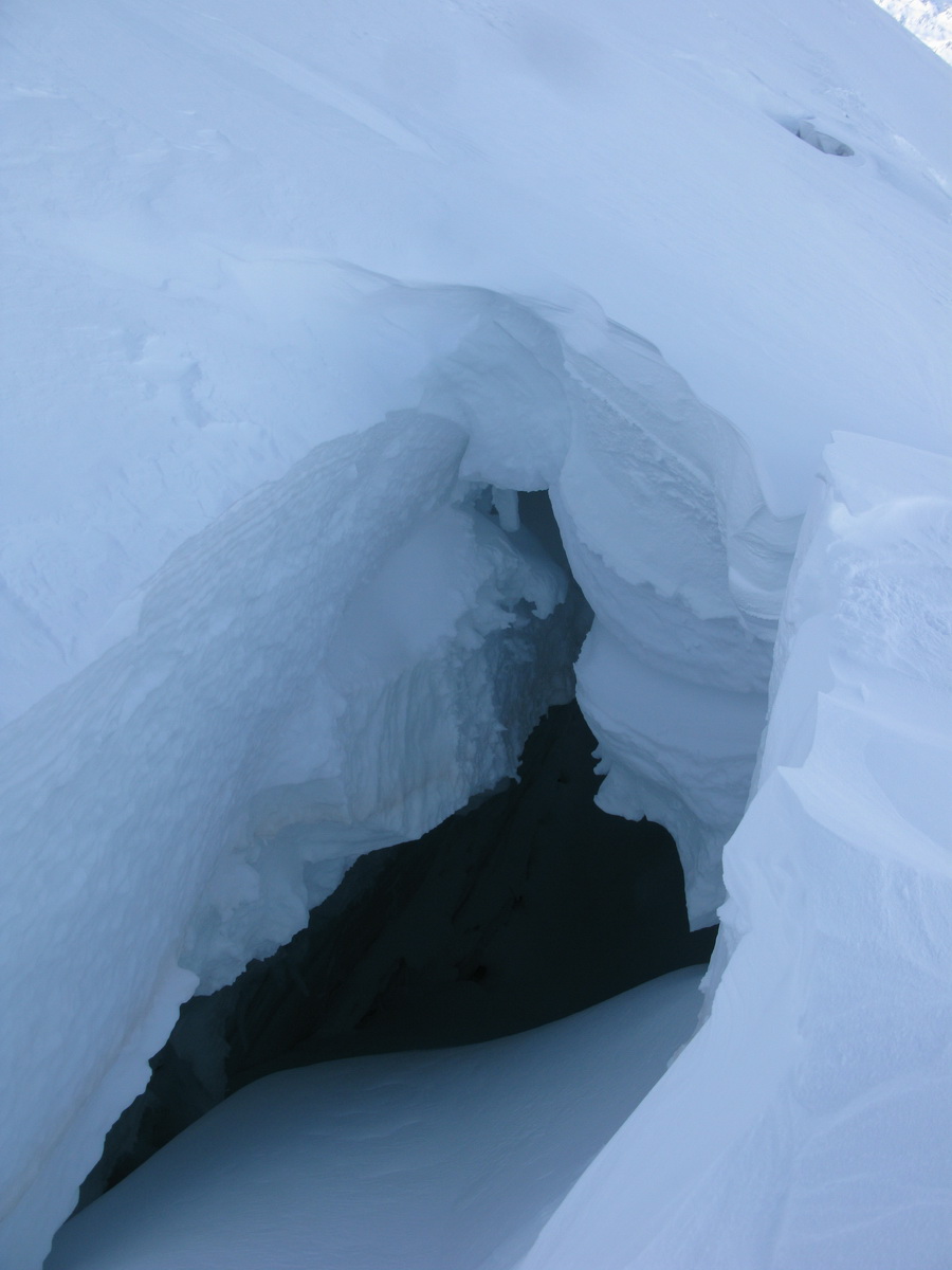 Stúpam hore a kľučkujem medzi naviatymi doskami, snažím sa hľadať tvrdé miesta, kde sa v mačkách neprebáram. Prichádzam ku veľkej trhline. Z leta spred dvoch rokov si ju nepamätám. Ľadovec sa mení... Obrysy trhliny pozakrývanej mostíkmi vidno krížom cez celý svah.