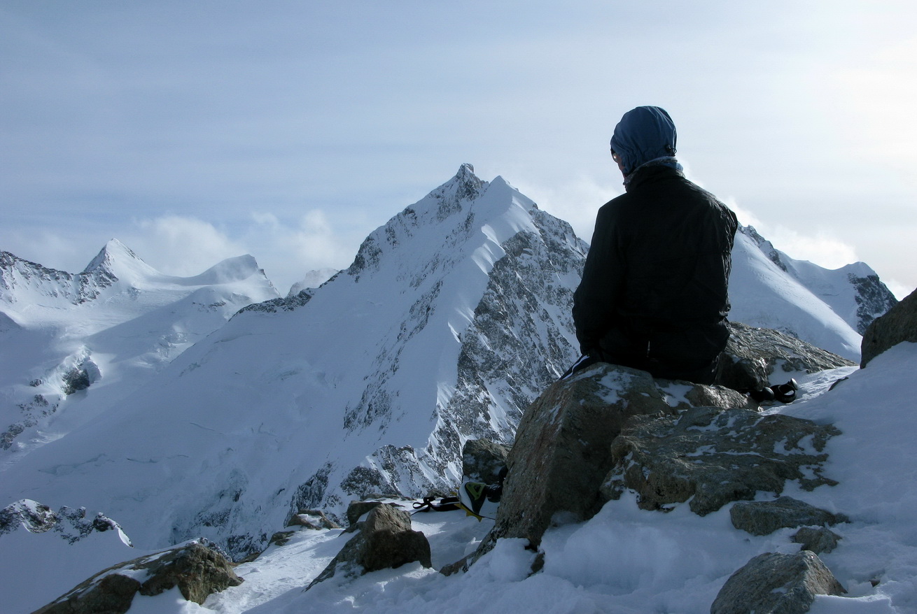 Prichádzam po ľadovci bez trhlín pod západnú stenu Morteratschu. Najprv stúpam hore na lyžiach ale záver do sedielka na hrebeni už idem v tvrdom snehu s lyžami v rukách. Je tu tvrdo a strašná zima. Rozhodujem sa nechať lyže tu a ďalej pokračujem s mačkami na nohách.