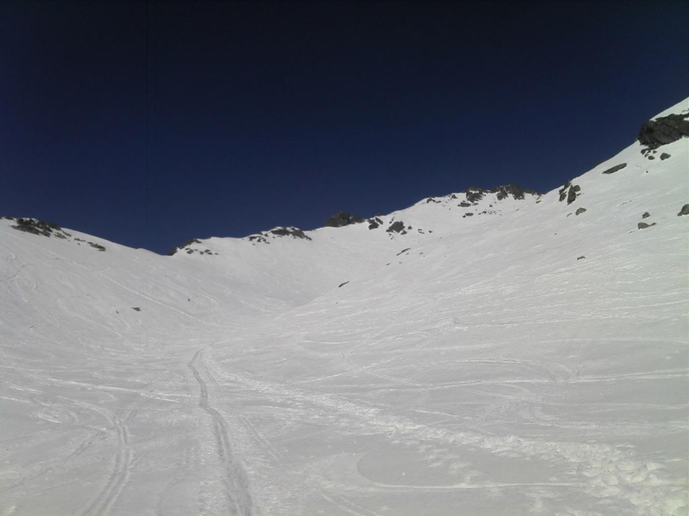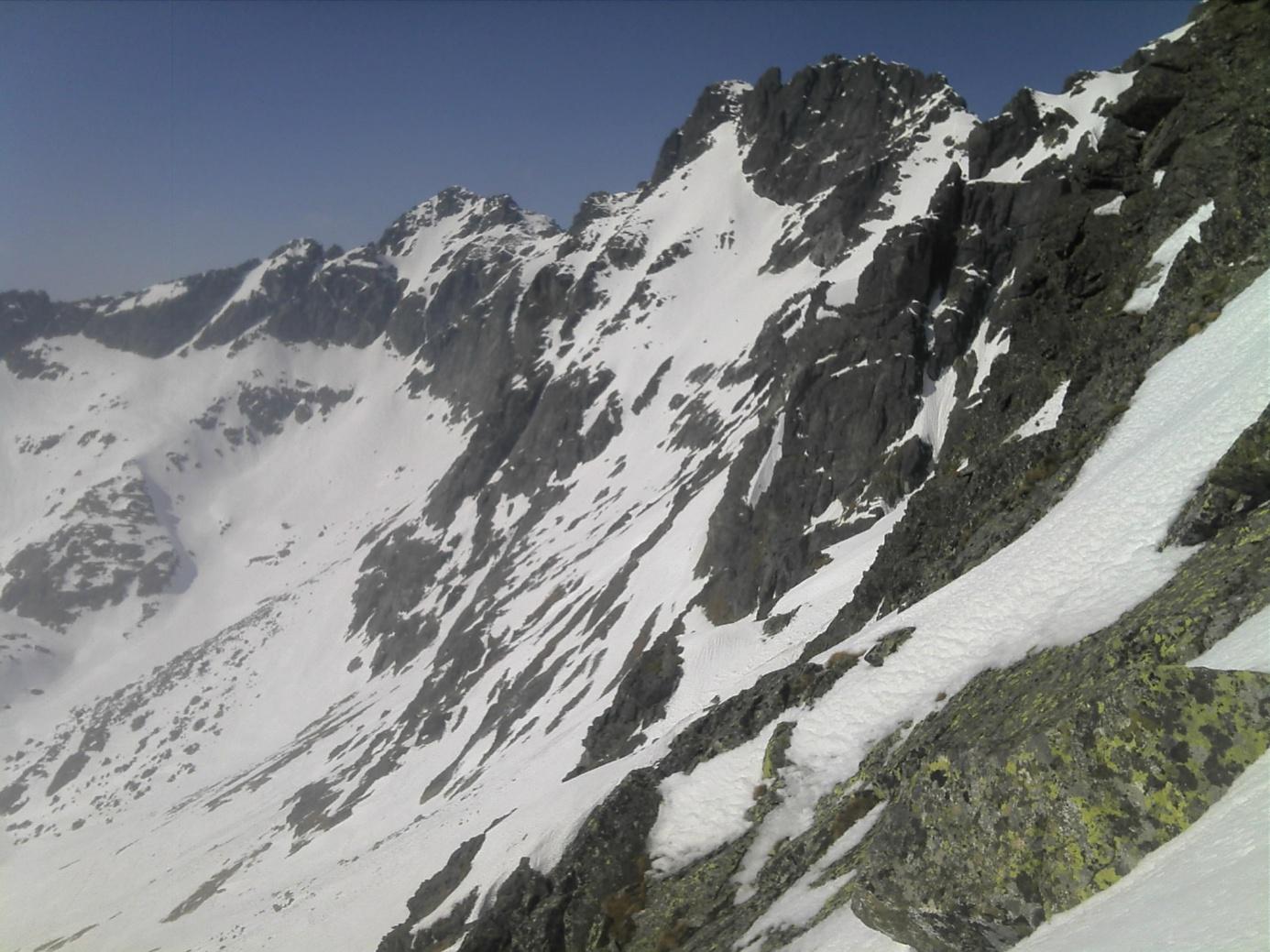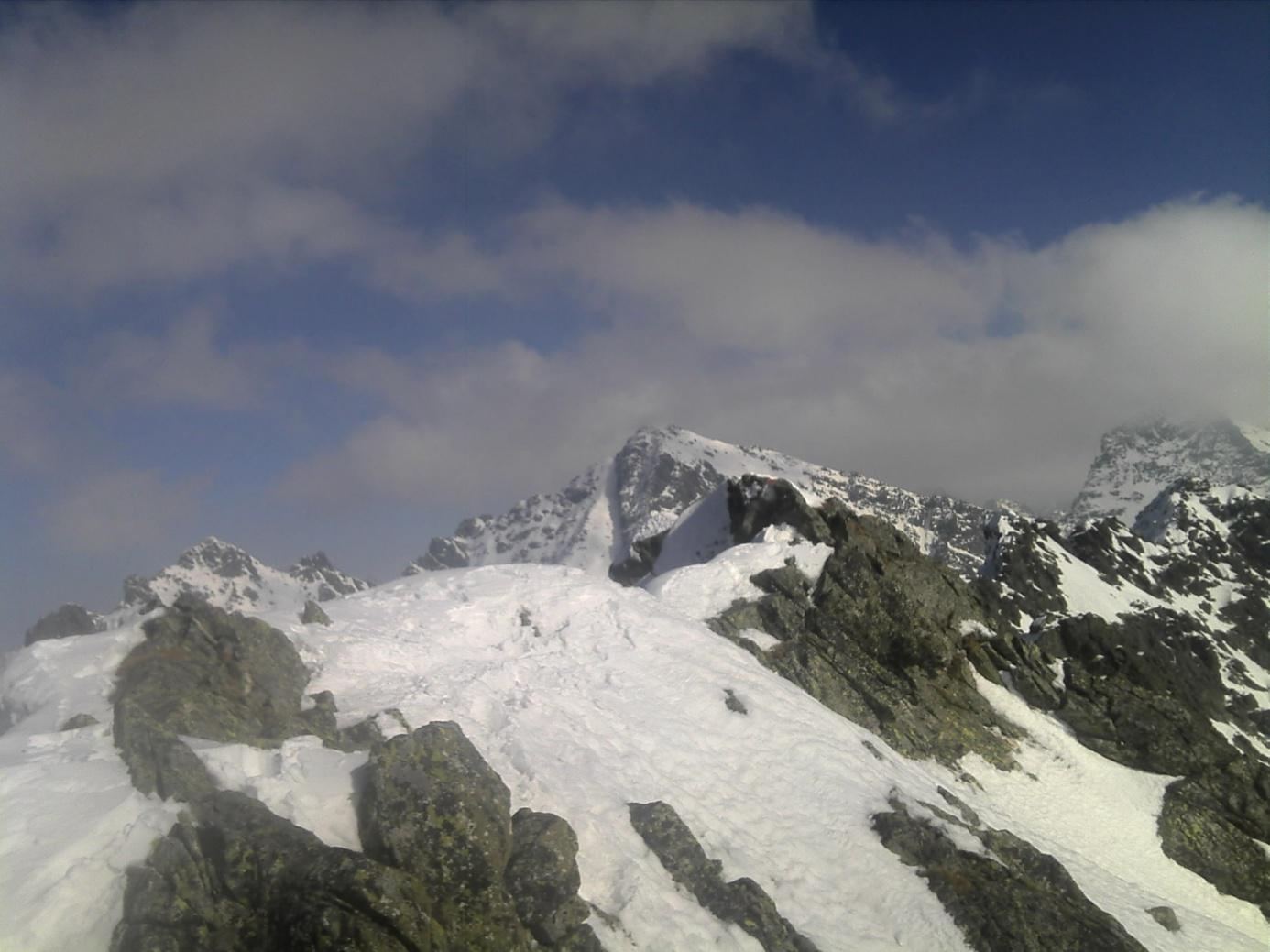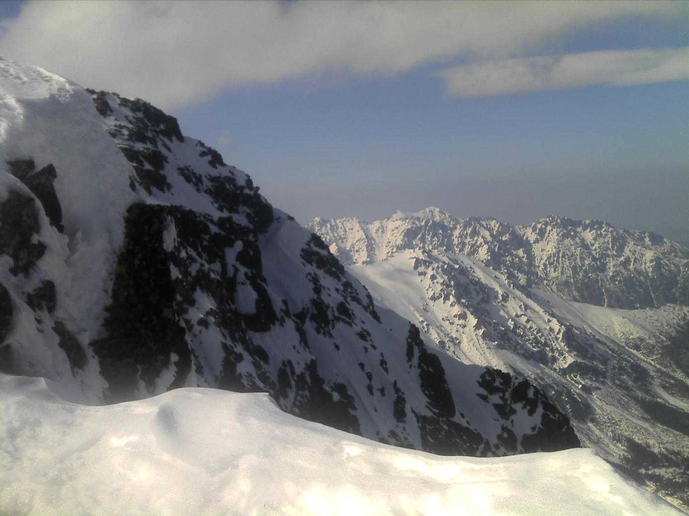Najprv zľava a potom aj sprava lákajú široké, úzke aj uzučké žľaby Bášt a Popradského hrebeňa, široká Ostrva; idúc za nosom, dostal som sa až k Hincovej vežičke, myslel som že je to bezmenné miesto, ale z mapy som zistil, že asi všetko vo Vysokých Tatrách je pomenované. Z priložených fotiek vidieť snehové pomery, žľab z Rysov na turistickej ceste na Morské Oko, hrebeň z Východného Mengusovského Štítu dole k Čiernemu Stavu, uzáver Mengusovskej doliny. Sneh už bol firnový a preto aj bezpečný v ten deň.