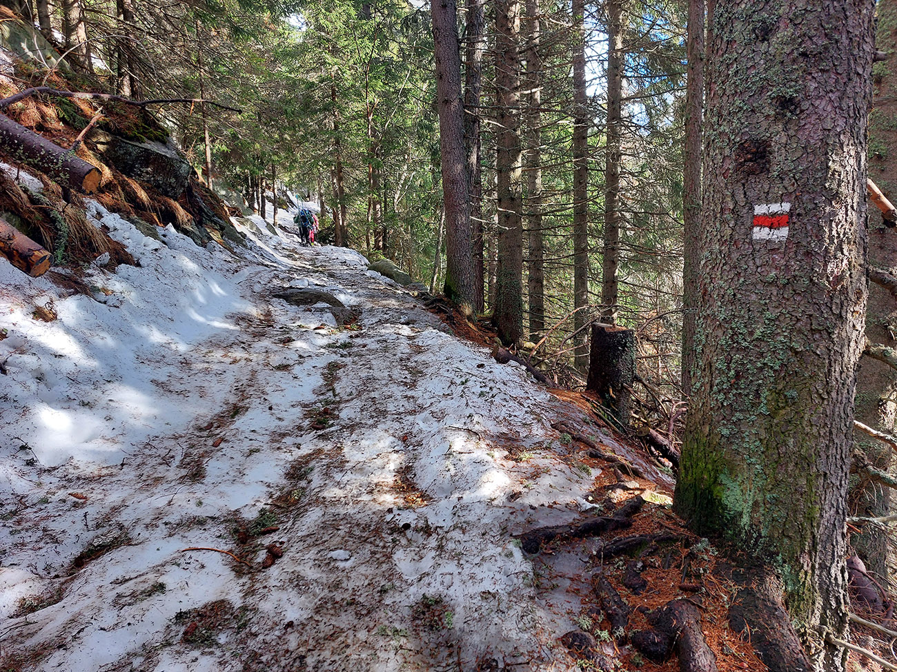 Rozbitý po sobote, chcel som sa ísť len s domácimi snehmi rozlúčiť, ale nejako nedopatrením ma zavialo do Tatier. To len ako výhovorka, prečo z Mengusovskej nebude toho viac – v podstate len Široký žľab a biedny pokus o Volí chrbát. Našťastie som nebol jediný nevládny, tak som nebol za brzdu a pohodové tempo mi véééééľmi vyhovovalo. Z domu sme vyrážali ešte za dažďa, ale mraky mali rýchlo odtiahnuť a malo nastať dočasné ažúro – asi do obeda. Potom ďalší front a pokles teploty pod nulu ešte počas dňa. Ráno bolo čvachtavo a teda poriadne - aj na Štrbskom plese, odkiaľ sme vyrážali. V pláne bola Mengusovská, že tam sa nejako a niekam hádam schováme pred dobiedzavým sz vetrom. Podobný program ako pred dvoma týždňami ( report je tu ), akurát, že „od parkoviska“ už to nešlo, poctivo sme si lyže vyniesli až tam, kde letný chodník vychádza z lesa, ďaleko za Triganom. Lebo v lese toľko špiny na chodníku, že nám bolo pásov ľúto: