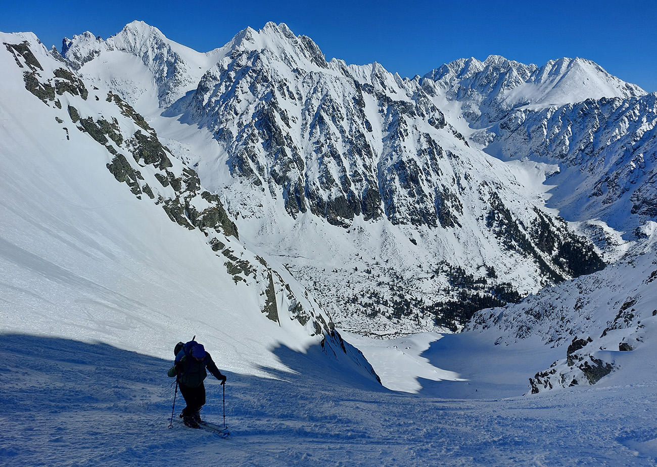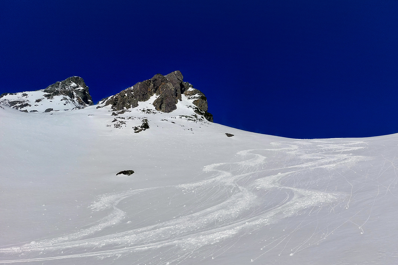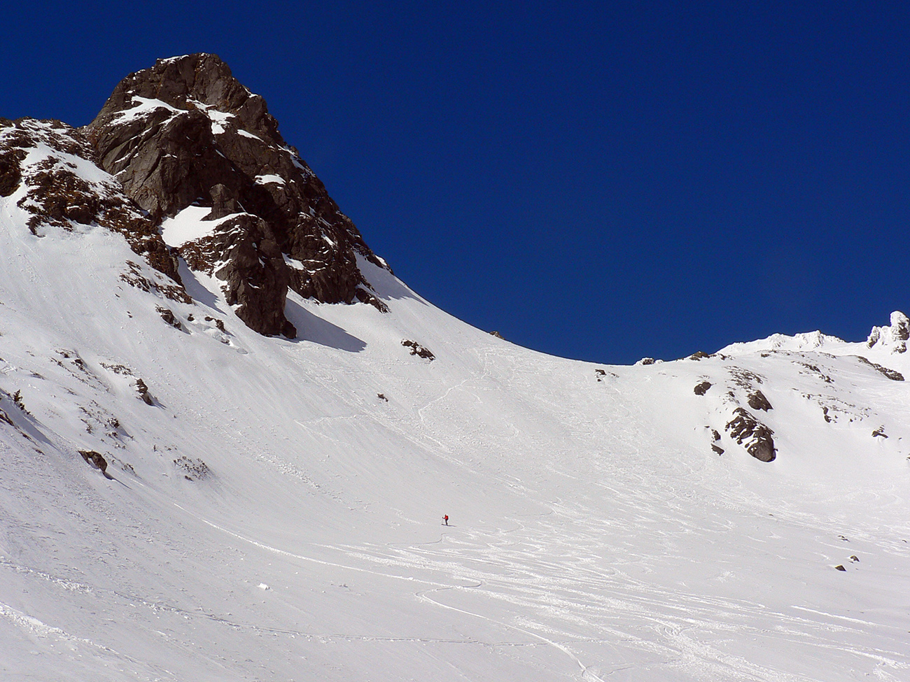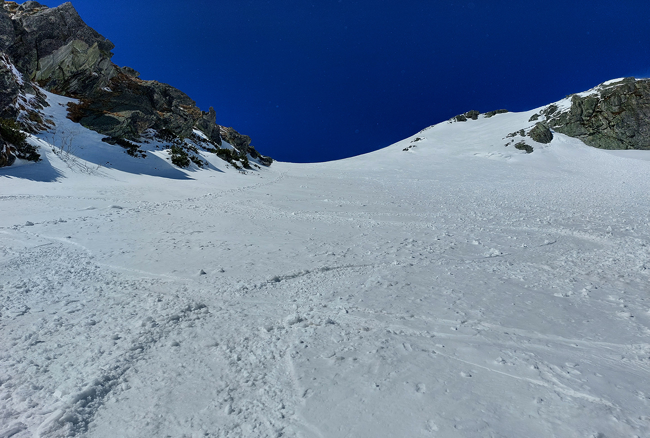 Dole k mostíku sme ale nešli, odbočili sme doľava a cez kosovku sme natraverzovali rovno pod Široký žľab a ten sa nám zapáčil. Lebo podložka príjemne mäkká (natopený firn) a piati predjazdci ťahali stopu priam profesionálne. Vyššie, v strmšom, už o bolo suchšie a boli ta zo dve miesta, kde sme aj rozmýšľali nad haršajzňami (mokrý firn alebo v tieni prášok na tuhej kôrke), ale ešte vyššie viac suchšieho a lepšie državého snehu, skoro prašanu, najmä v tieňoch na južnej strane žľabu. Aj kde bol už odhrnutý lyžujúcimi, dala sa do kôrky pod ním jednoducho hrana zaseknúť, nebol to hrubý ľad. Takže komfortne až hore a tam okrem pár nárazov vetra parádne, tichúčko. Ten ďalší front v nedohľadne.