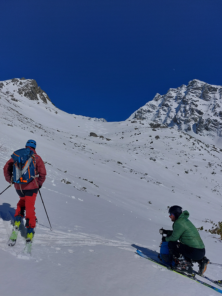 Ešte bolo trochu času aj síl, tak sme od potoka začali dupať v ústrety Žabím plesám, už so slnkom za chrbtom. Ale obe spomenuté dôležité komodity sa rýchlo míňali, tak sme skončili niekde pod prahom Volej kotliny a zahanbene sme začali strácať výšku po červenej značke smerom ku potoku. Celkom fajn jarná lyžba, lebo slnco tam malo ešte svoje slovo.