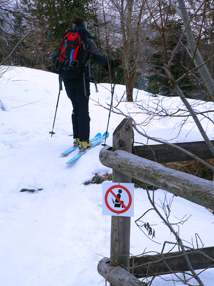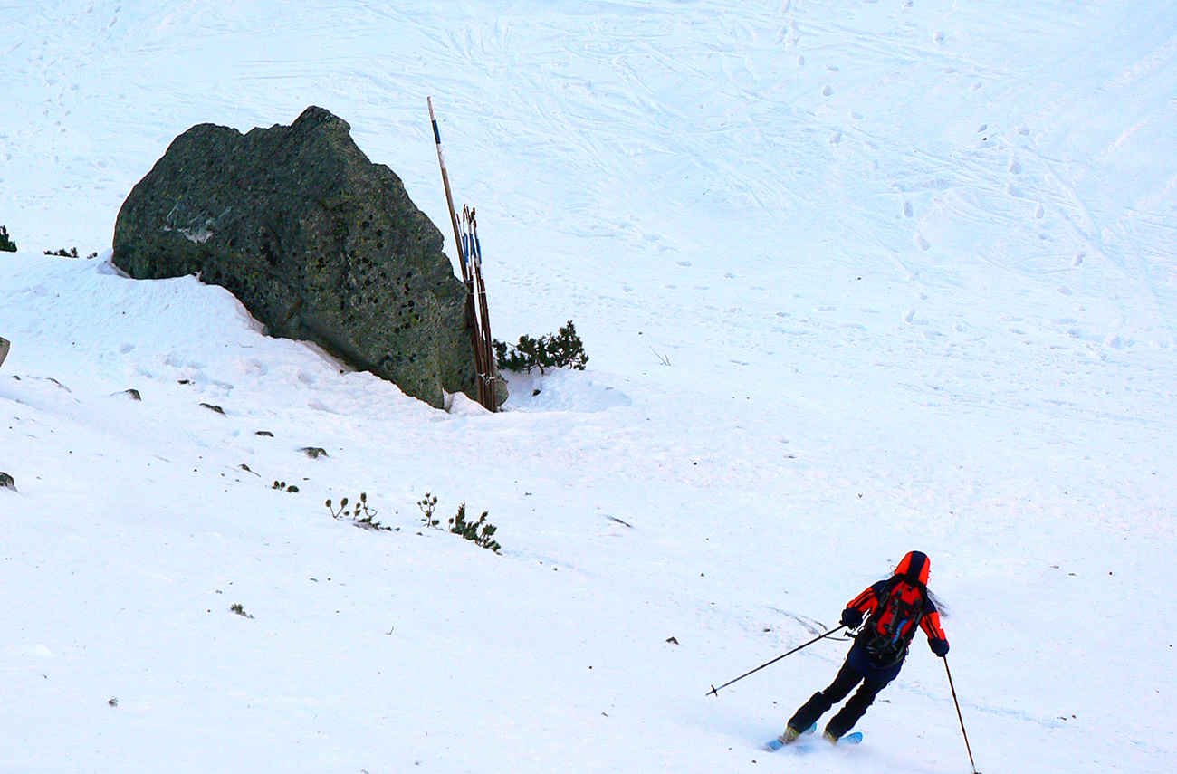 Stúpame zatiaľ tieňom doliny popod rozžiarené hrebene a čuduj sa svet: oproti nám schádza stále viac ľudí. Peši od Zbojníčky. To už sme za Húpačkami, za Bufetom. Pod Bránou to zostrmie, je to vyšmýkané mnohými lyžami, ale dalo by sa aj bez komplikácií - len si netreba zabudnúť zaaretovať špičky viazania :-)