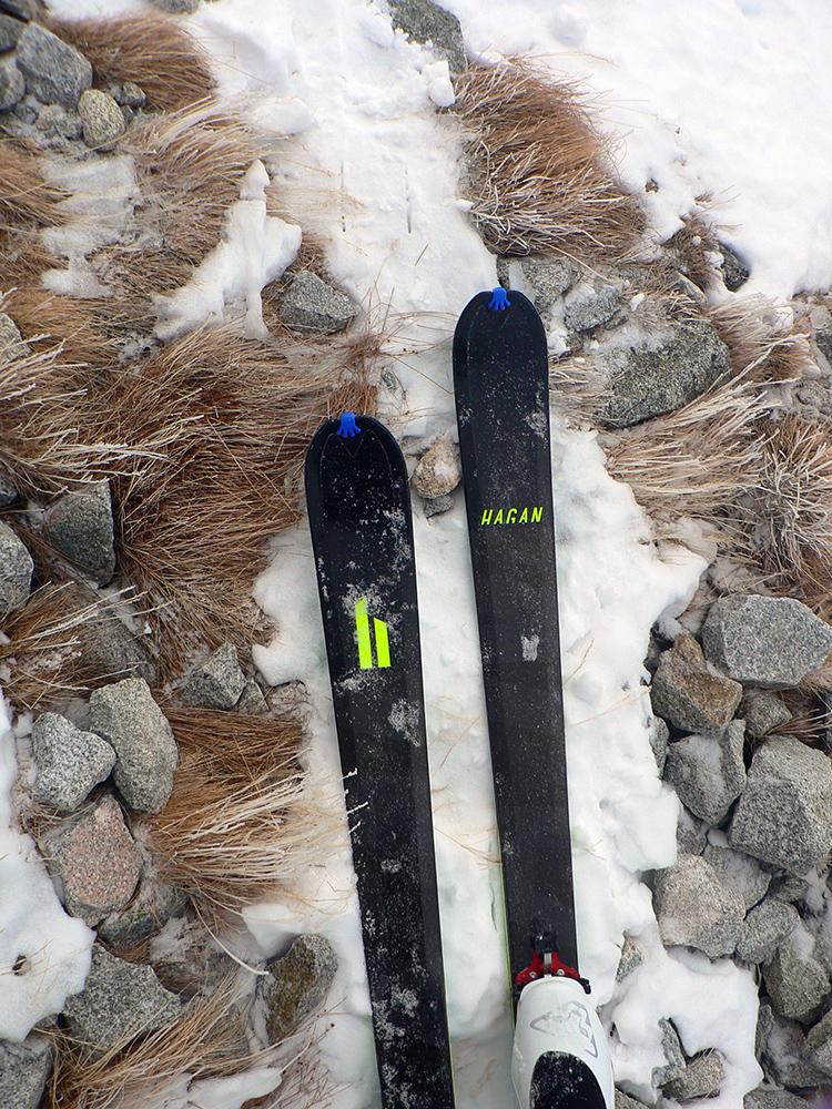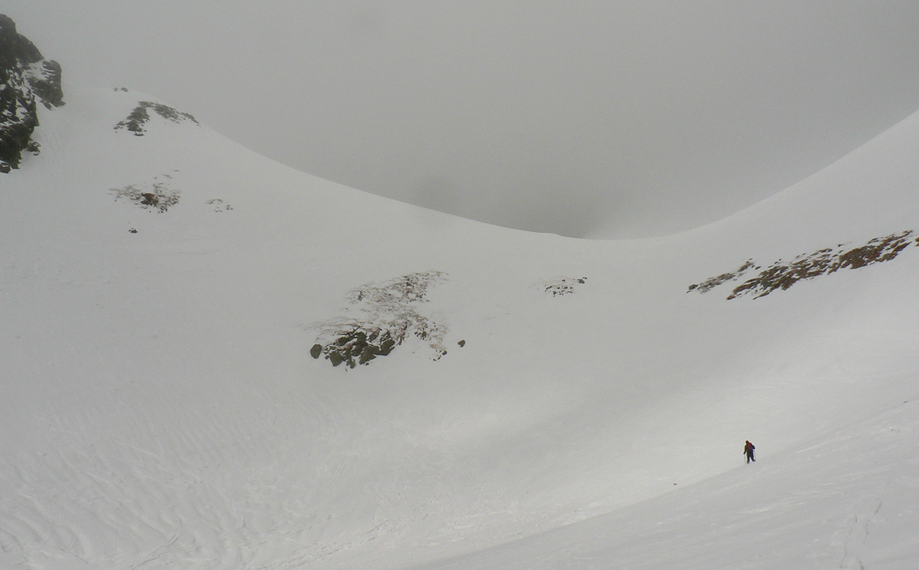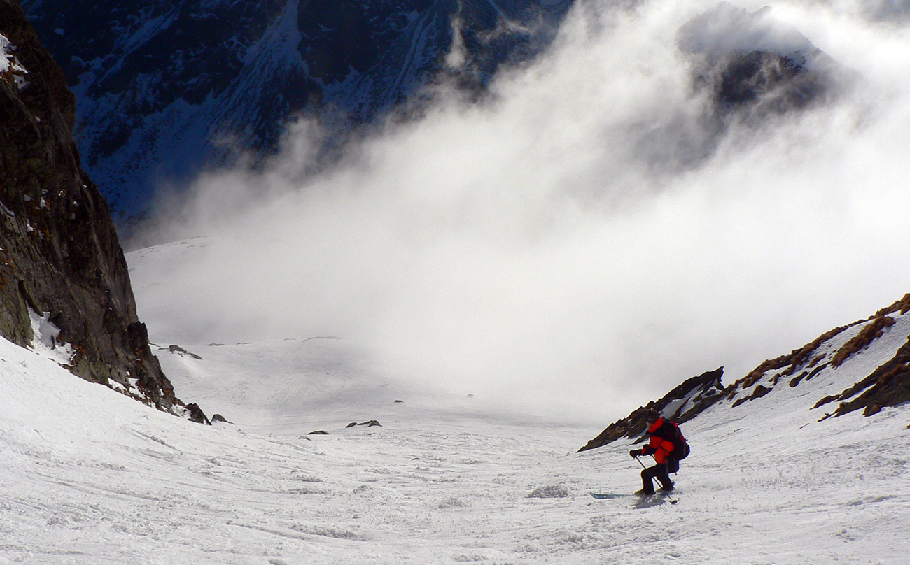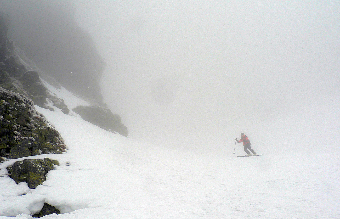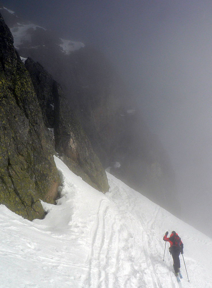 Potom už bez trapasov odbočujeme do Generála a dolinou oproti nám už dobre fučí jedovatý „severáčik“ od západu. Obliekame, noríme sa do mlieka. Prvé strmšie stúpanie sa dá na pásoch, kolmo aj cik – cak. Pod Závratom ale už nahadzujeme haršajzne, ale tie sa s rastúcou výškou odmietajú zakusovať do „podkĽADU“. Aj keď stopa je. No ideálna skôr pre korčule.
