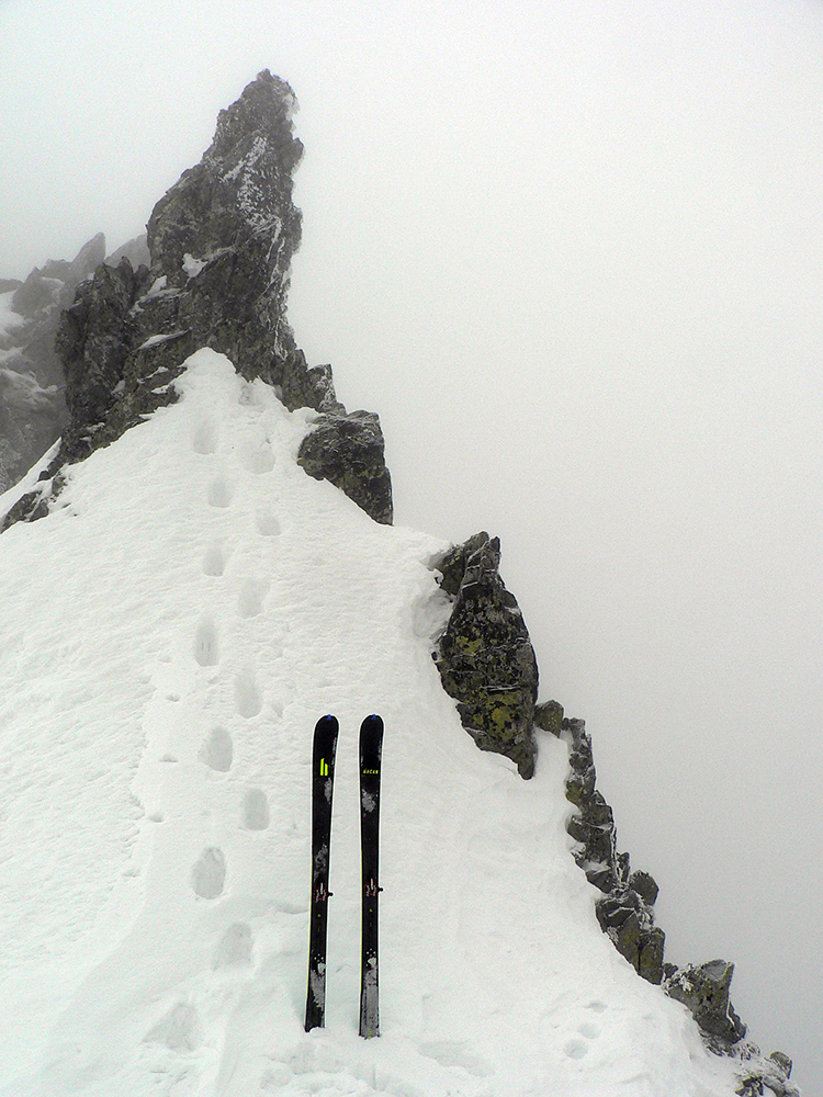 Posledné desiatky výškových metrov teda na mačkách pešo, nech sa tie zubane celý víkend nevozia nadarmo v batohu. Stopy sú, po ľavej strane popod stenu, ale je parádne ľadovo. Zato fučať prestalo a aj hore tíšina. V pohode na posedenie, dokonalý mliečny bar.