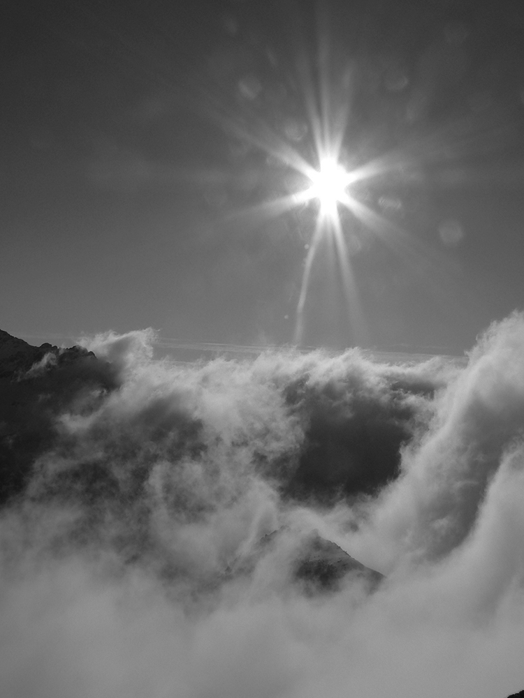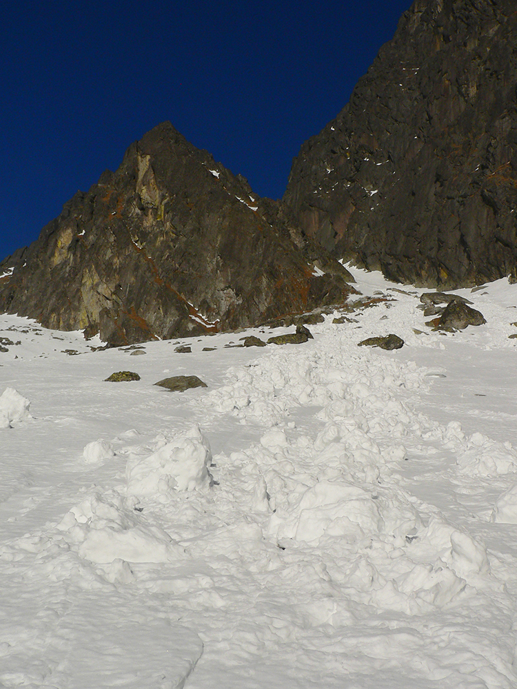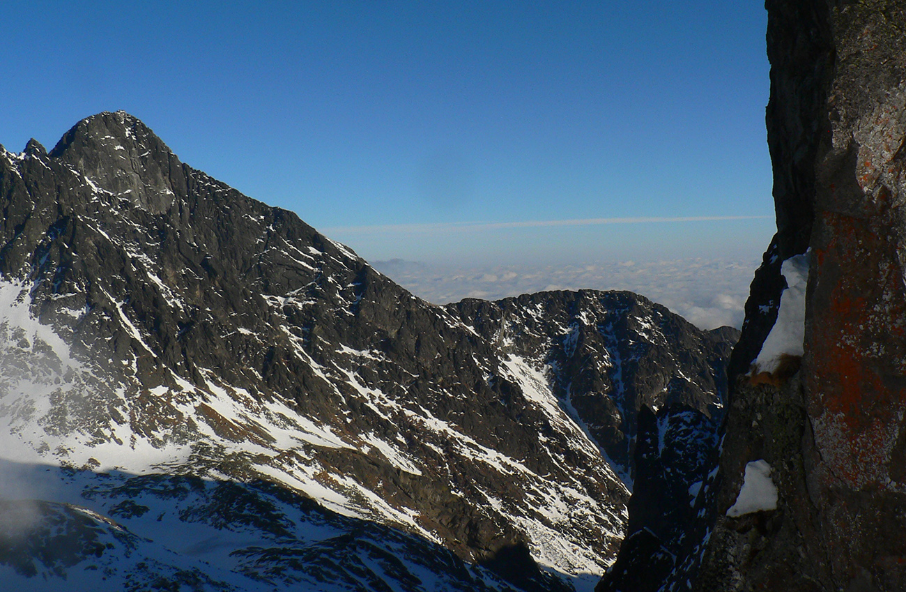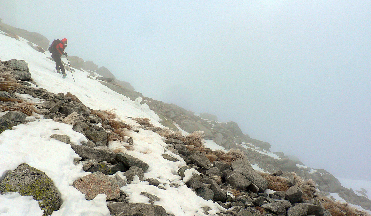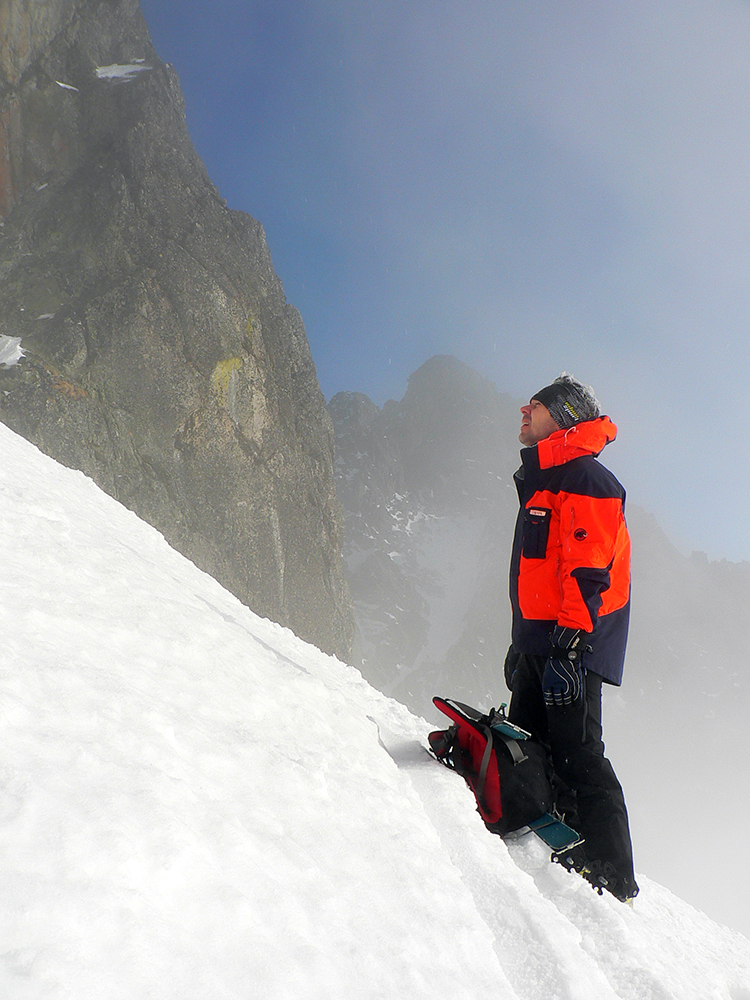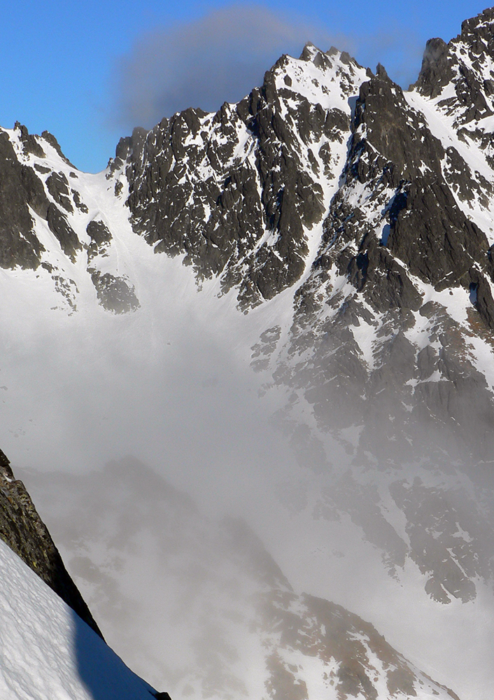 Miestami treba aj po kameňoch, miestami nepríjemné ľadové platne v sklone doprava - a dole sa žraločie zuby ceria. Až nad Sivým plesom snehu dosť, a aj dobre drží. A to mlieko začína rednúť a v stúpaní na Strelecké polia nás doháňajú závany takého homosexuálneho vetríka, ako by jar išla. Po čiernych bľeskoch zrazu stekajú kvapky vody.