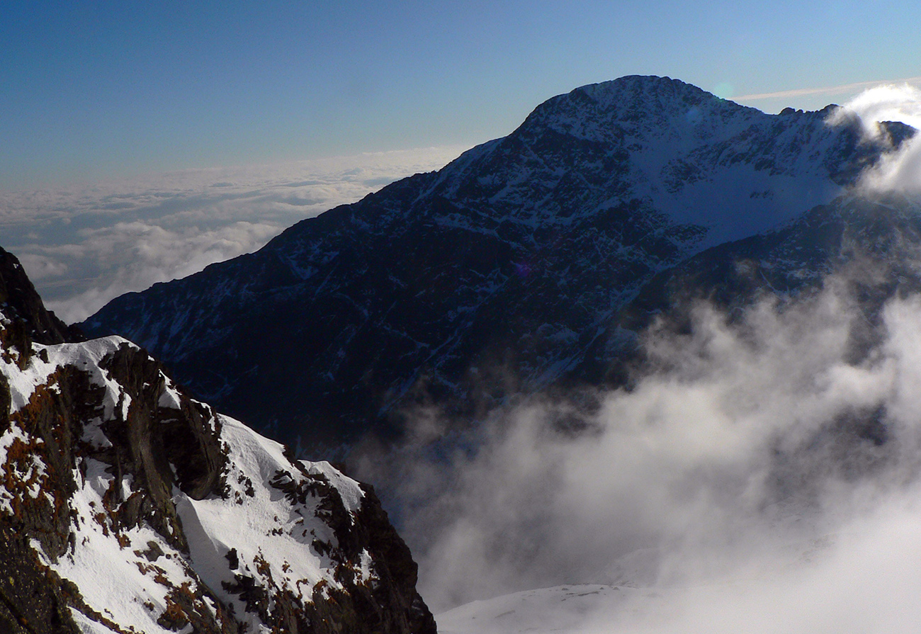 Ešte krátky a menej príjemný (lebo premrznutý) traverz pod Širokou vežou a ideme do finále. Lyže na chrbát a hore do Priečneho, tentokrát už bez mačiek. Sme akurát na hranici hmly, ktorá sem dobiedza od západu a spolu so slnkom z juhu vytvára zaujímavé efekty. Sneh jemne povolený a stôp habadej, tak dupeme do fialovejúceho neba.