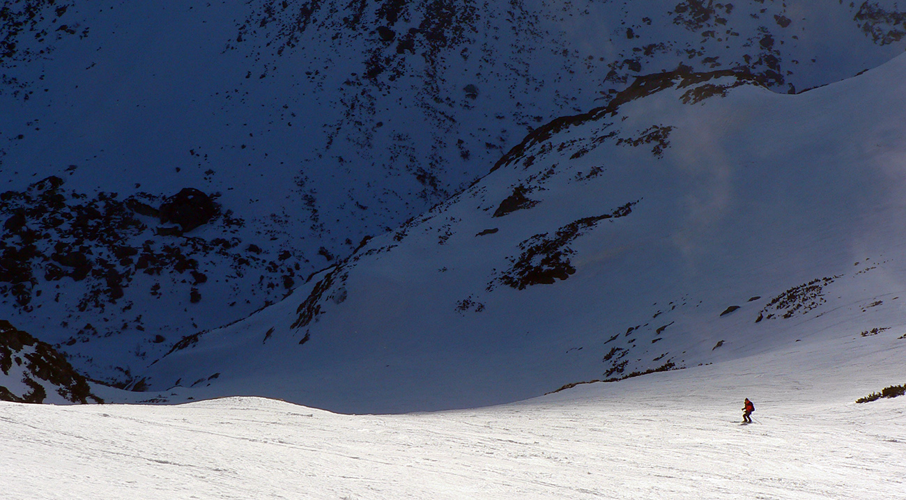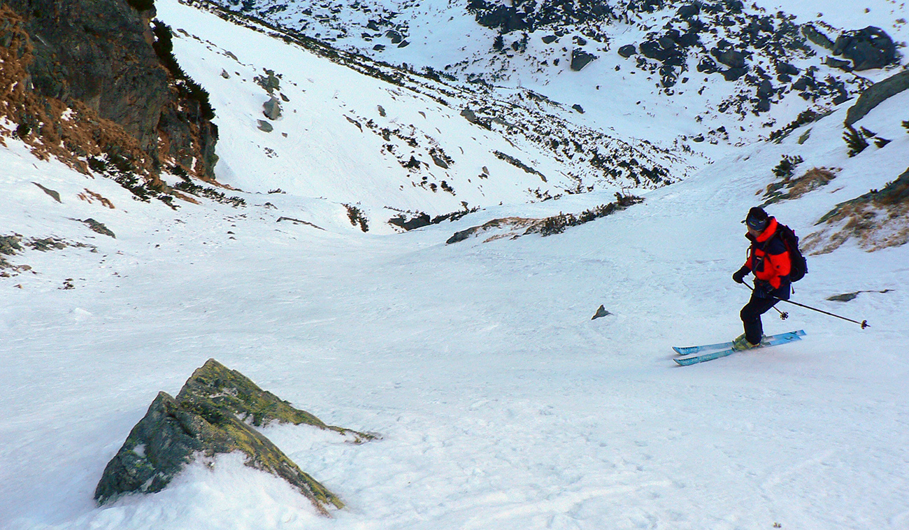 Do Rovienkovej doliny to vyzerá byť prudko lyžovateľné, rovné. My máme rozrytý betón, hnus je to. Aj nižšie je to už tvrdšie ako včera, teda hrkotavejšie. Robíme rachot na celú dolinu. Nad hangom zas pásy a popod steny Javorovej galérie pekne traverzovať, v podstate po žltej turistickej pod Priečne sedlo.