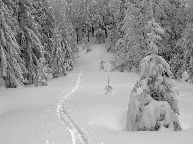 V polovici januára konečne poriadne napadlo aj v doline: z domu rovno v lyžiarkach, 10 minút popri Turci, prebehnem večne zapchatú a teraz aj nasolenú „I/18“ a obúvam sa do lyží. Chodník popri potoku, ktorý pripomínal prales, prebehli na jeseň buldozérom, takže až na pár (snehom ohnutých) kríkov v ceste nič nestojí. Čaká ma rovných 1000 výškových až na Krížavu k vysielaču. A výživných - véééľa nového snehu a je sobota ráno, kto by už len šiel predo mnou?