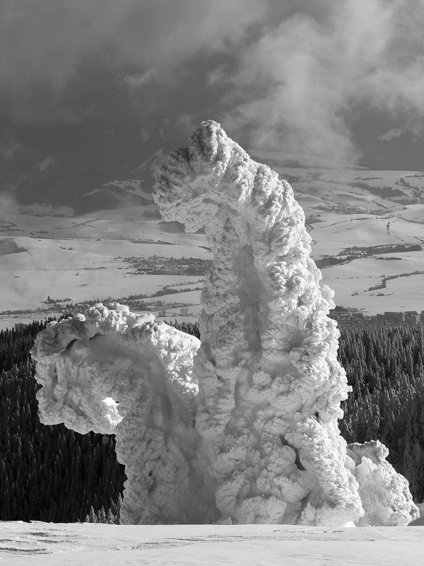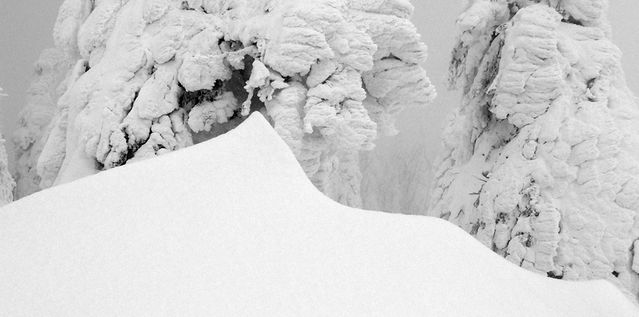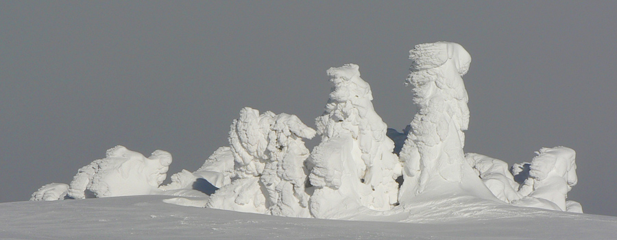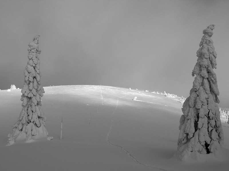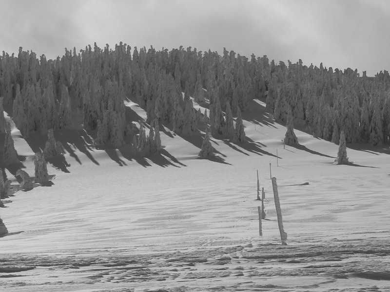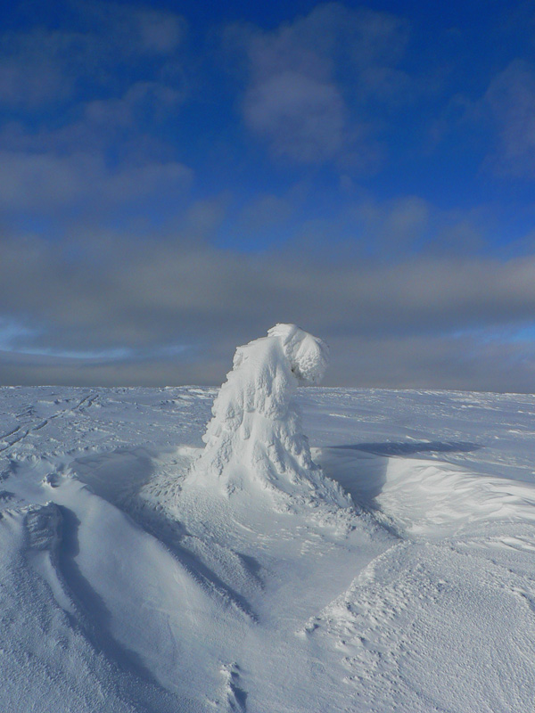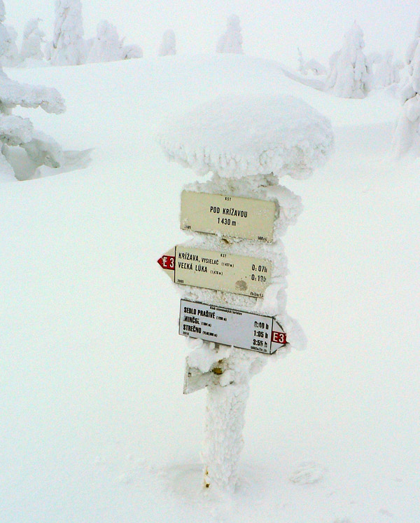 Na hrebeni biela tma, ale aspoň nefúka. Tyčové značenie v lese ledva trčí, záveje majú aj zo tri metre, stopa žiadna priamka, kľučkovať treba riadne pomedzi tie hory snehu. Na holých Šíravách naopak vyfúkané do ľadu, ale tu jediný raz vychádza slnko, tak chytro vyťahujem foťák.