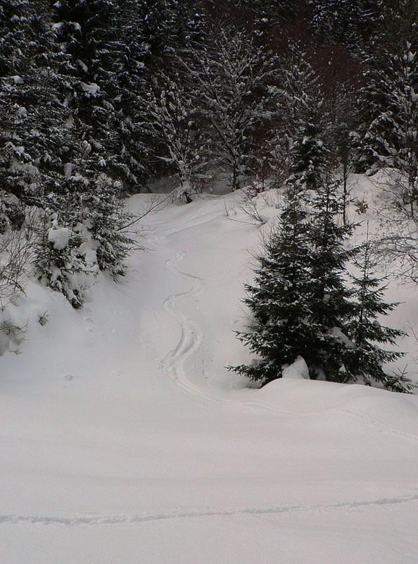 Takže ešte výplaz hore zjazdovkou, definitívne balím pásy, utesňujem rukávy, dávam okuliare a ide sa na to! Na rozlyžovanie 1200m rekreačnej zjazdovky, slalom pomedzi davy. Z jej spodku už žiadne „po ceste“ ale výsekom, kade mala viesť „olympijská“ zjazdovka :-))) Tu je sklon ešte malý a sneh už hlboký, nič moc. Krížom cez cestu, menší problém: ako preliezť na lyžiach cez čerstvo vyfrézované, vyše metra vysoké mantinely? S rozbehom sa darí, len šoféri nechápu - sklznice nad ich strechami :-) Potom už čerešnička na torte: nekonečné oblúčiky v prašane riedkym lesom. Od zjazdovky dolu na zvážnicu je to asi 1500m dĺžky a 350m prevýšenia. Len konárom sa treba občas vyhnúť. No, Alpy to nie sú, ani tatranské žľaby, ale mám to doma priamo pod nosom!