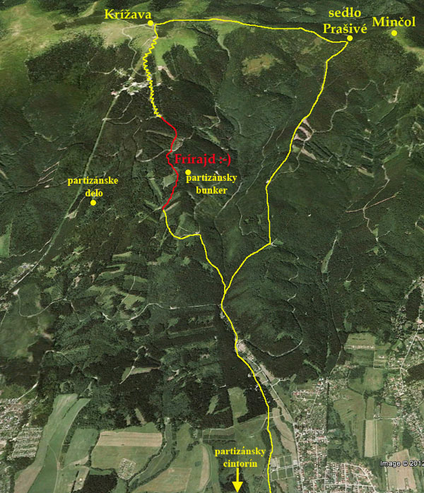Okolo vysielača sa posúvam už zas len po pamäti a chytro po zjazdovke k dolnej stanici lanovky. Ešte kúsok dolu po ceste a už si užívam „skratky“ - až pod partizánske delo sa to dá krásne zlyžovať. Keď už som rozbehnutý, spustím sa až dolu na Stráne po serpentínach a smerom nazad hore si pre zmenu „užívam“ tie najstrmšie spodné skratky. Ruky dostávajú zabrať, keď pásy nestíhajú :-) Ale nejdem rovnakou cestou až hore: na poslednej serpentíne odbočujem k partizánskemu bunkru, ešte trocha nohy potrápiť prešľapávaním prašanu. A obzrieť, či sa môj tajný frírajdový terén „už dá“. Dá, super!!!