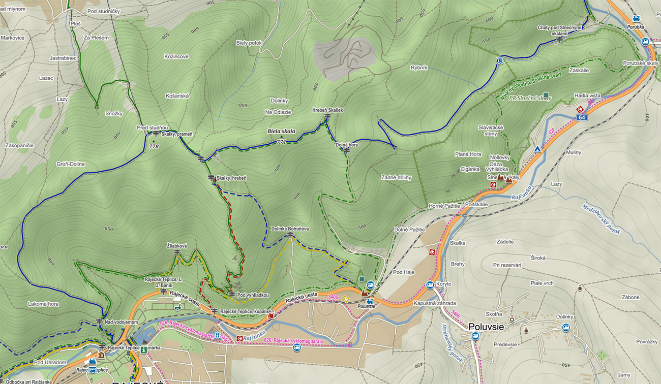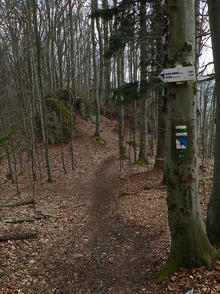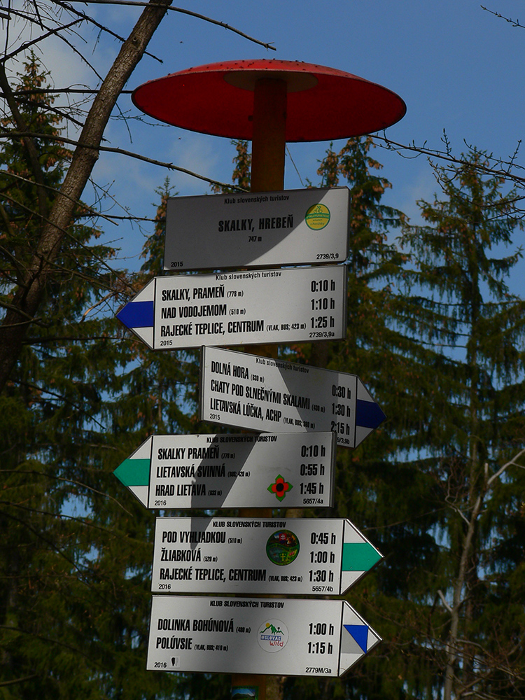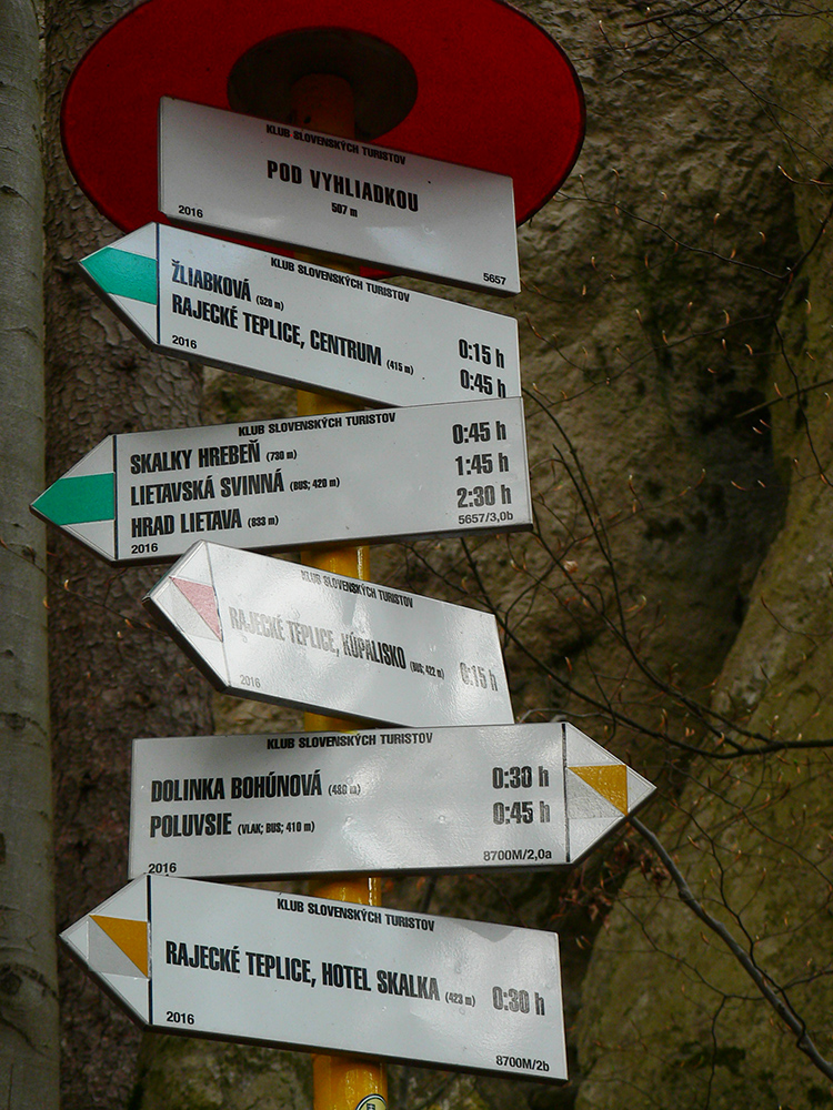 Najprv som teda využil „Náučný chodník Slnečné skaly“, ktorý ma previedol tým najlepším, čo z cesty vidieť aj nevidieť – smerom na severovýchod až k Turskej skale. Potom nazad po opačnej strane hrebeňa po modrej značke a zhora z hrebeňa Skaliek po zelenej cez početné vyhliadky až skoro dole do Rajeckých Teplíc. Návrat do Poluvsia po miestnej žltej, príjemným traverzom po singlíku popod skalné steny. Takých 5 – 6 hodín aj s odbočkami, kochačkami a obzeračkami.