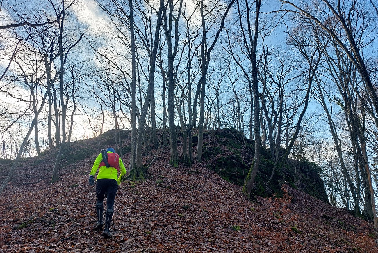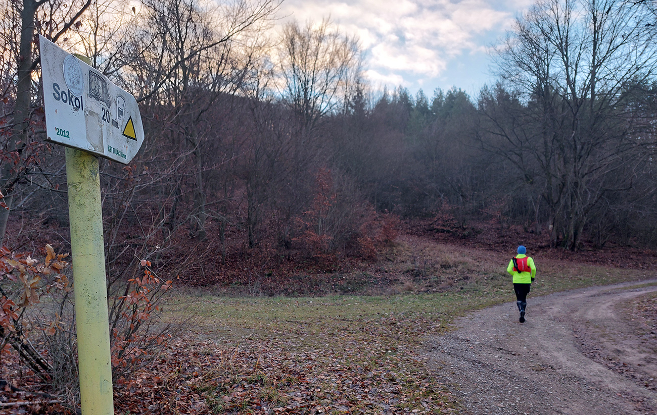 Takže z Ilavy plynulé stúpanie až pod Sokol po veľmi príjemnej lesnej ceste až chodníku (odkedy sme sa oslobodili od asfaltu) – len nie po žltej značke, ale vyššie nad ňou po takej paralelnej lesnačke. Na Sokol potom strmo po vlhkej hline a lístí. Odmenou bol výhľad na slnko vyliezajúce spoza Vápča rovno do mrakov.