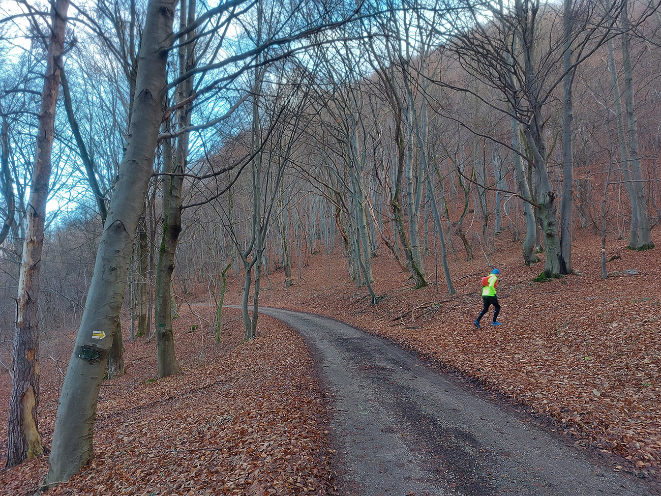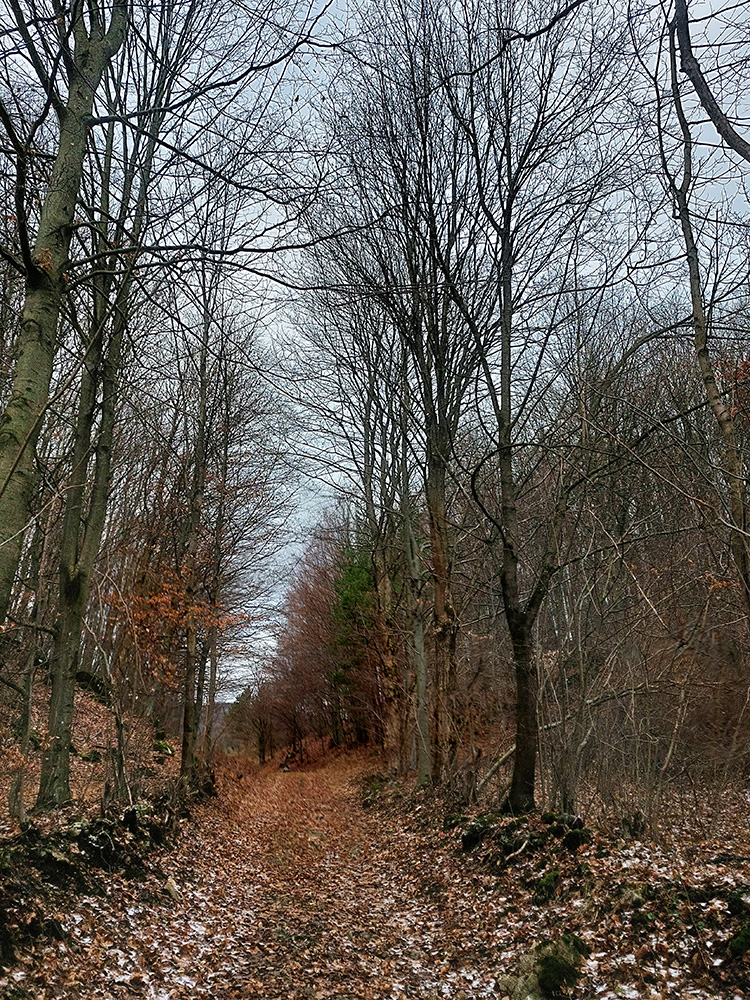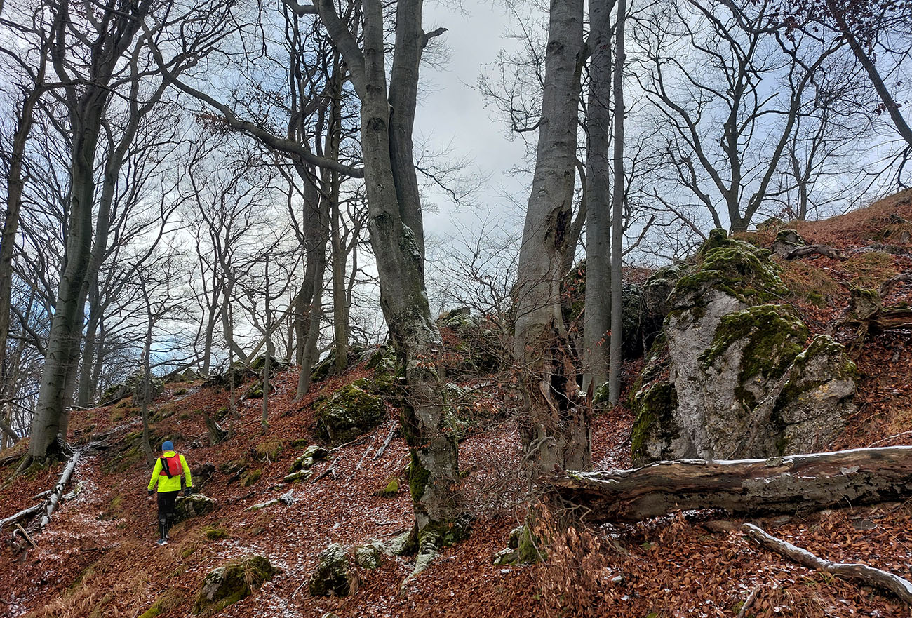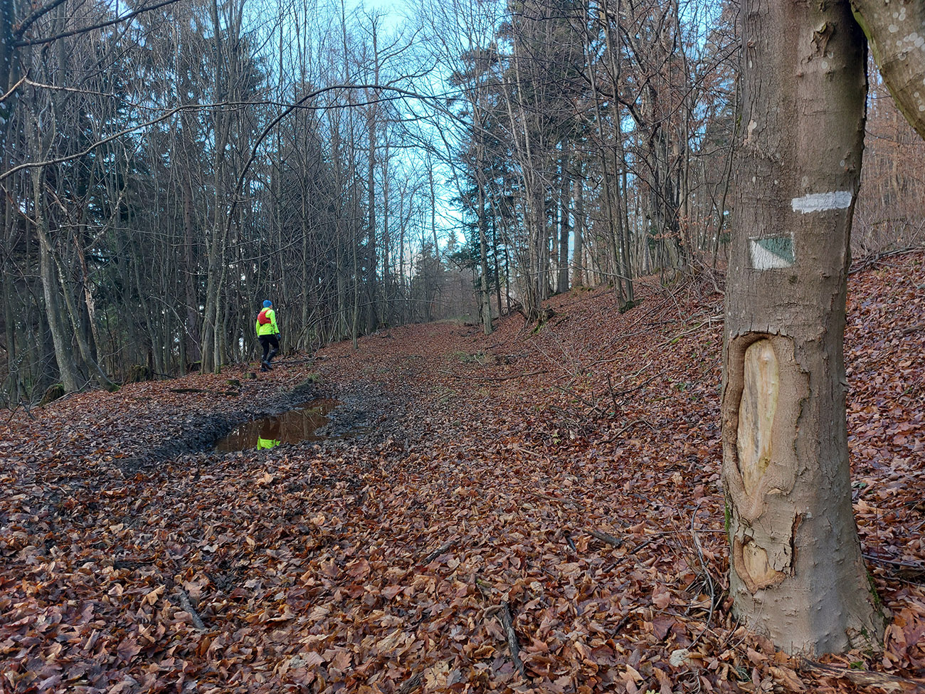 Zostup dole prudký – najprv ešte po hrbatom hrebienku celkom príjemný, aj pre oči, len potom čím strmšie, tým šmykľavejšie a zákernejšie – pod klzkým lístím klzké blatko, a ešte aj tie poskrývané slizké konáre, no mňam! Nižšie na zvážniciach zas tie kilové závažia na botách. Nad Slopnou sme nadobro opustili značky, a že dole do Beluše prerazíme po lesných cestách. Len je ich tam toľko, že navigácie pracovali naplno.