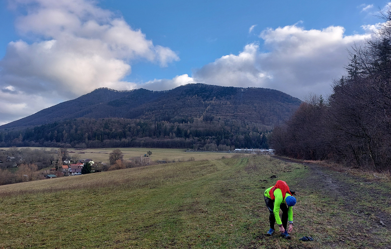 Záver už bol pohodový – aj slnko zas vyšlo, aj blata ubudlo, po východe z lesa sa pred nami otvorili široké rozhľady na Považie. Tak už len oklepať čo najviac podrážky a preasfaltovať sa cez jednu z najväčších našich dedín na vlakovú zastávku (tá je naopak jedna z najmenších, ktovie prečo). Tam sme debordelizáciu viac-menej úspešne dokončili, lebo nik nás potom z vlaku nevyhadzoval, a bolo po podarenom výkluse. No, nech je takých aj v budúcom roku čo najviac. A aby som nezabudol, treba mi poďakovať parťákovi za pózovanie, spoluúčasť a čaj v cieli :-)