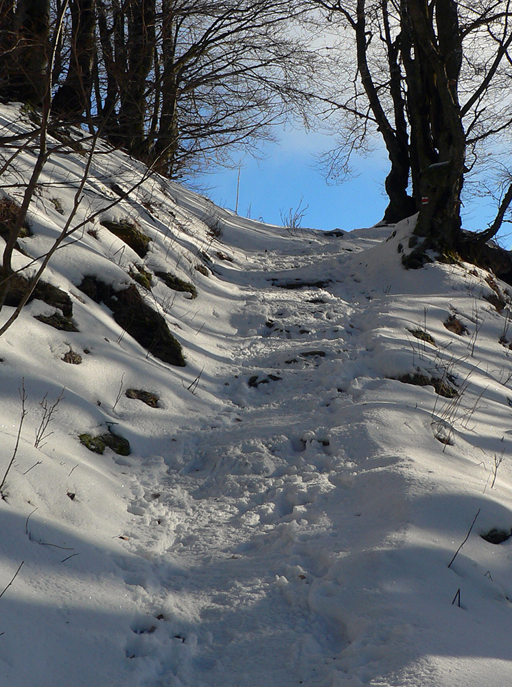 Nakoniec sa mi ale podarilo prebojovať až do Hiadeľského sedla a pošmýkal som sa po rovinke ešte asi kilometer smerom na Korytnicu (po modrej popod Prašivú). V lesoch za Poliankou na bežeckých stopách bez problému, pod Štrosmi len v strmších sklonoch trčali kamene, ale smerom do kopca sa dalo preštrikovať. Zošup po ceste k útulni pod Kečkou pohoda až na jeden, dva šutre, trčiace spod snehu. Cestou hore lesom na Kečku v závere známe kamenné schodíky, tiež štrikovateľné.