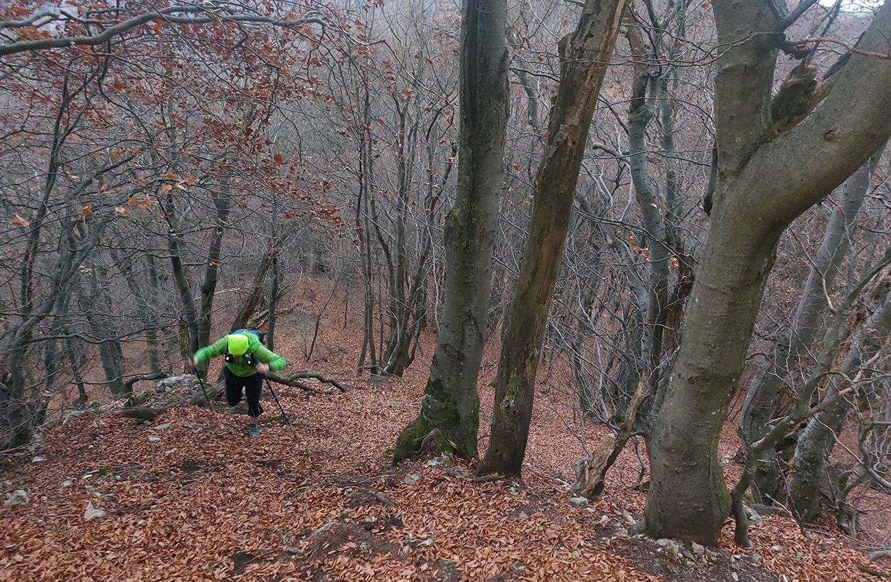 Prvé dve stúpania (Malé Bradlo a Sokolí kameň) výborne poslúžili na roztriedenie stáda. Ale aj tie noholomné spádnicové zbehy z nich. Nenapichnúť sa na niečo, to chcelo dobrú dávku šťastia alebo zručností. Hneď po vbehnutí do prvého lesa sa objavil pod nohami mix lístia, konárov, bahnitých pascí a iných neviditeľných zákerností na zriedka používanej zvážnici – čiže to, na čo sa tu všetci tešili. Že hlavný páchateľ Patrik M. poistil úvod stúpania za Brúsnym lanom, to hovorí asi za všetko.