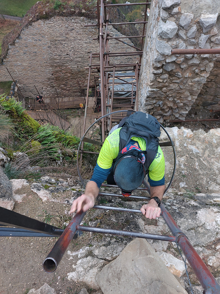 Z K15, teda z krmelca v Záskalí, som radšej zdrhol čím skôr, lebo ak by som si tam dal niečo zo Slavovej ponuky, asi skončím niekde v kúte v prenatálnej polohe. No najmä čakalo suverénne najpomalších 17 km – zhruba päť hodín mi to trvalo, a to sa mi obávaný hrebeň Havranej skaly išiel dobre, lebo som naň bol pripravený osvedčenými chemickými zbraňami, zostrujúcimi zmysly a „rozširujúcimi realitu“. Tam sa niekde potknúť, nájdu ma až na jar. Aj to len možno. Rozcvičkou boli Drieňovka, Bosmany a Ostrenec, dorážkou Súľovský hrad. Lenže okolo neho bol ten megahrboľatý chodník vyčistený a bez závejov lístia, tak sa mi zdal normálne až pohodlný na behanie. Je to o zvyku, že? :-)