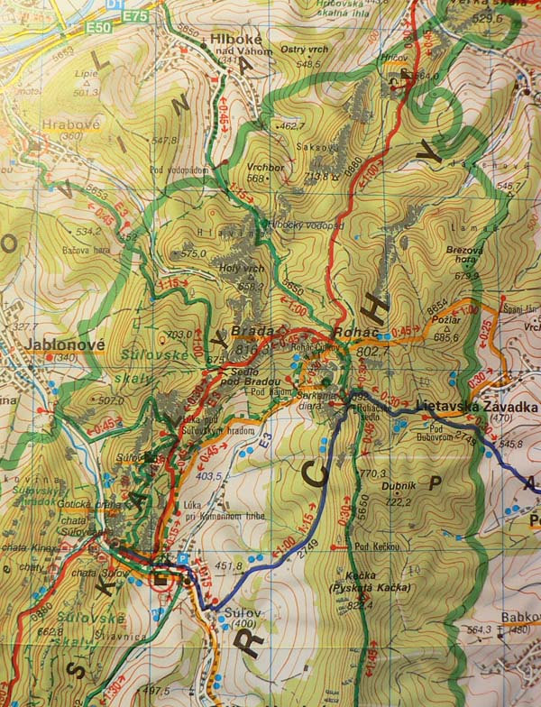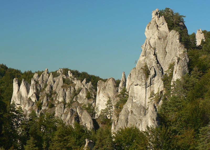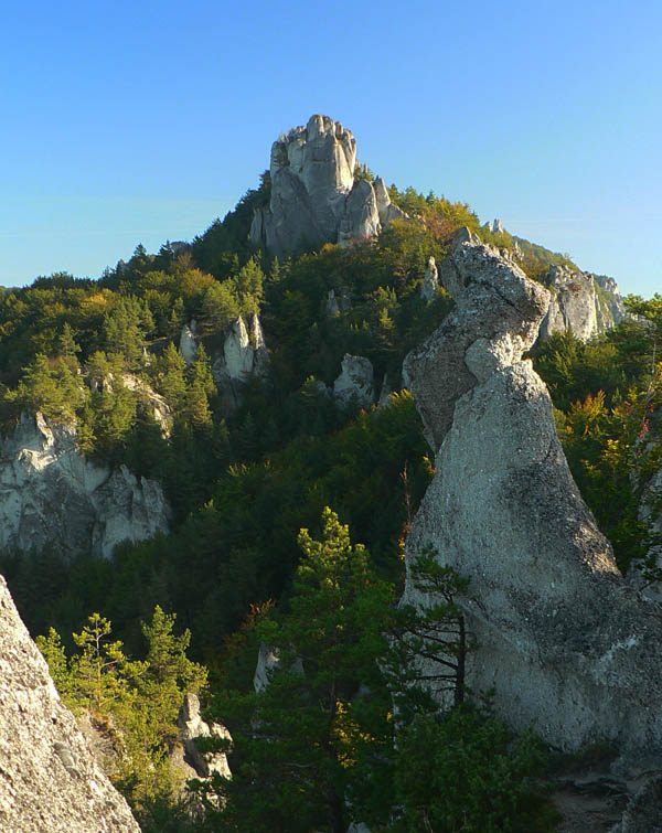 Je to neskutočná kombinácia, keď sa k sivo-bielym skalám a modrému nebu pridá červená, žltá a zelená farba jesenného lesa. Notoricky známa (a okolo obeda aj riadne preľudnená) hrebeňovka nie je celá po červenej značke, ako býva zvykom. Od parkoviska pod dedinou cez Súľovský hrad je to po zelenej, z lúky pod hradom po červenej až do sedla Roháč, ďalej zas po zelenej do Roháčskeho sedla. Pokračovanie hrebeňa do sedla Patúch už neponúka také bombastické výhľady, preto sme z Roháčskeho sedla zavelili na ústup modrým chodníkom nazad do Súľova.