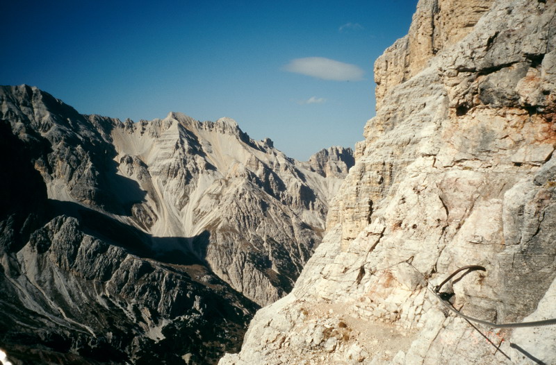 Viedla po exponovanom traverze. Konečne lano, trochu som sa upokojil. Chodníček viedol stále po traverze, nenaberal som žiadnu výšku. "Kedy to už začne stúpať?" Pýtal som sa sám seba. Odrazu traverz skončil. Obzerám sa chvíľu, kým zbadám oceľové lano. Ajaj! tak to ide pekne do kopca. Pozerám sa na exponovaný úsek. Prípadný pád by skončil dole v doline...