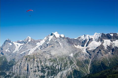 " Noc bola krátka. O tretej hodine sme stáli s kamošom Markusom opäť pred chatou. Čakal na nás výstup na štvortisícovku Jungfrau cez Rotalgrat. Na vrchol sme vyliezli skoro ráno. O ôsmej už boli naše paraglajdy pripravené na štart. Boli sme obdarovaní perfektným severozápadným vetrom, ideálnym pre štart. Môj let trval 27 minút, kým som pristál na ľadovci pod severnou stenou Mnícha.