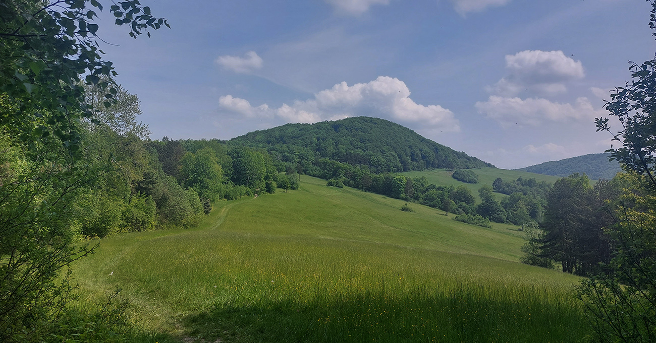 Na Kráľovej studni (22. km) tankujem do brucha aj do fliaš čo to dá, lebo najbližšia voda bude vraj až na 52. km, v sedle Cigeľka. Zatiaľ ale stačí, osobne nemám veľkú spotrebu vody, navyše počasie mám ideálne. Ráno bolo zatiahnuté, ale po vlhkom a teplom týždni začal fúkať poriadny severák. Hore v korunách poriadne hučí, mňa dole akurát dobre ovieva, a ešte som aj v tieni. Len keď ma občas vyhodí na lúky, cítim silu slnka. Hlina pod nohami v lese je ale taká akurát, nelepí ani sa nepráši.