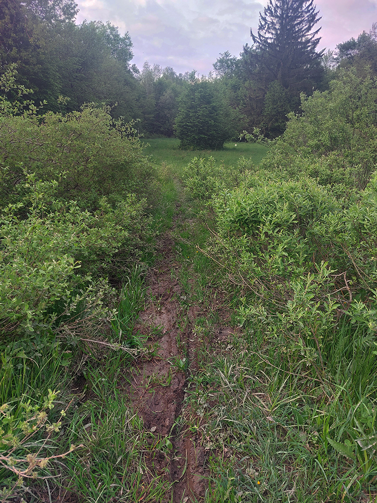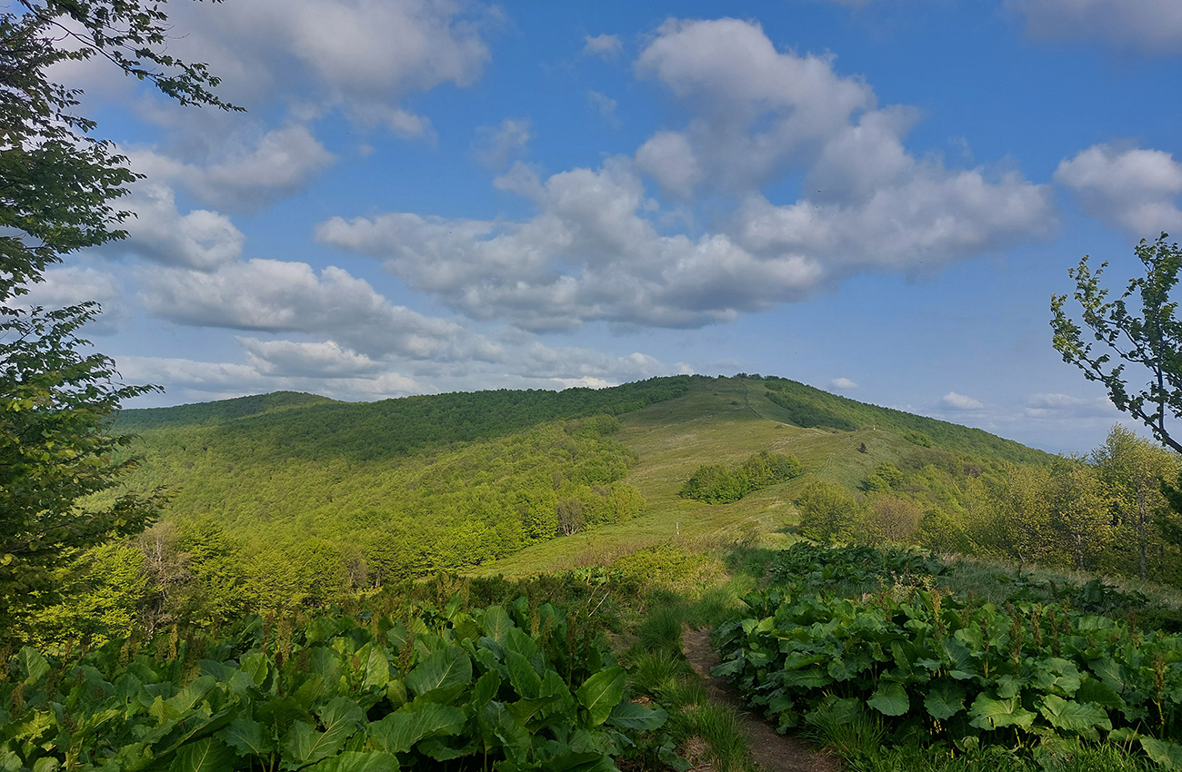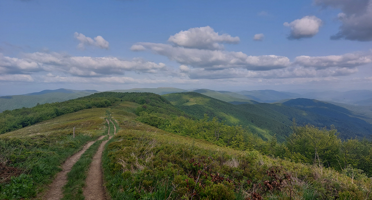 Za sedlom Dujava znovu nejako viacej lúk. Pekné rozhľady, ale cesty niet a tráva vysoká, pre istotu zapínam gps. Sklony sa zmierňujú, ale aj cesta sa zužuje do chodníka a tunel sa často uzatvára konármi a krovím. Okolo sedla Zajačí vrch to pod nohami niekde aj čvachtá, niekde treba aj kľučkovať, v početných koľajach stojí voda. Zrazu čo to, halucinácia? Nie, to len hraničiar na koni ide oproti. Nechápem, ako sa tade dokáže predierať a ako sa niekde zohýna. Za ním dokonca bikepacker tlačí svoj naložený stroj. Tak tomu závidím ešte menej. Pred Polianskym sedlom je lesný priesek na dlhšiu chvíľu naopak zase široký, navyše takmer rovný a bez prevýšenia, kluskanie až taká rozkošššš!