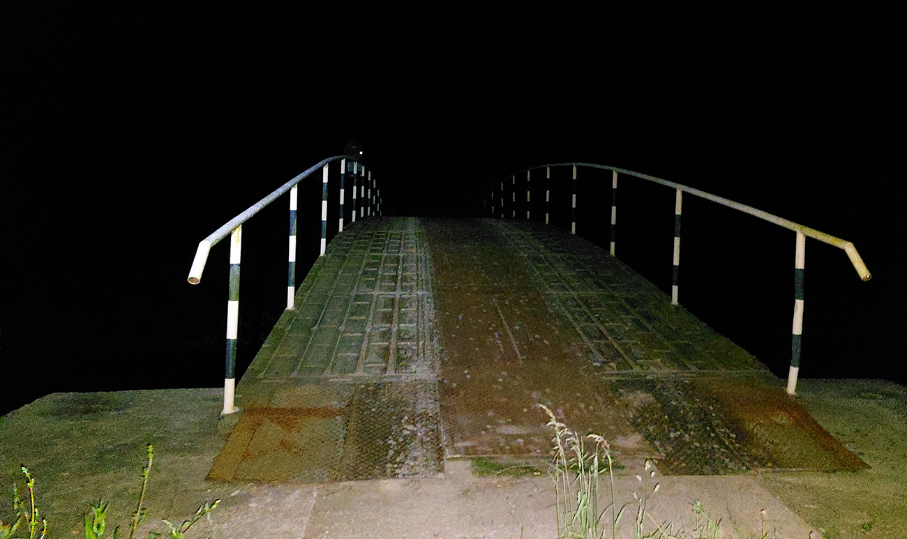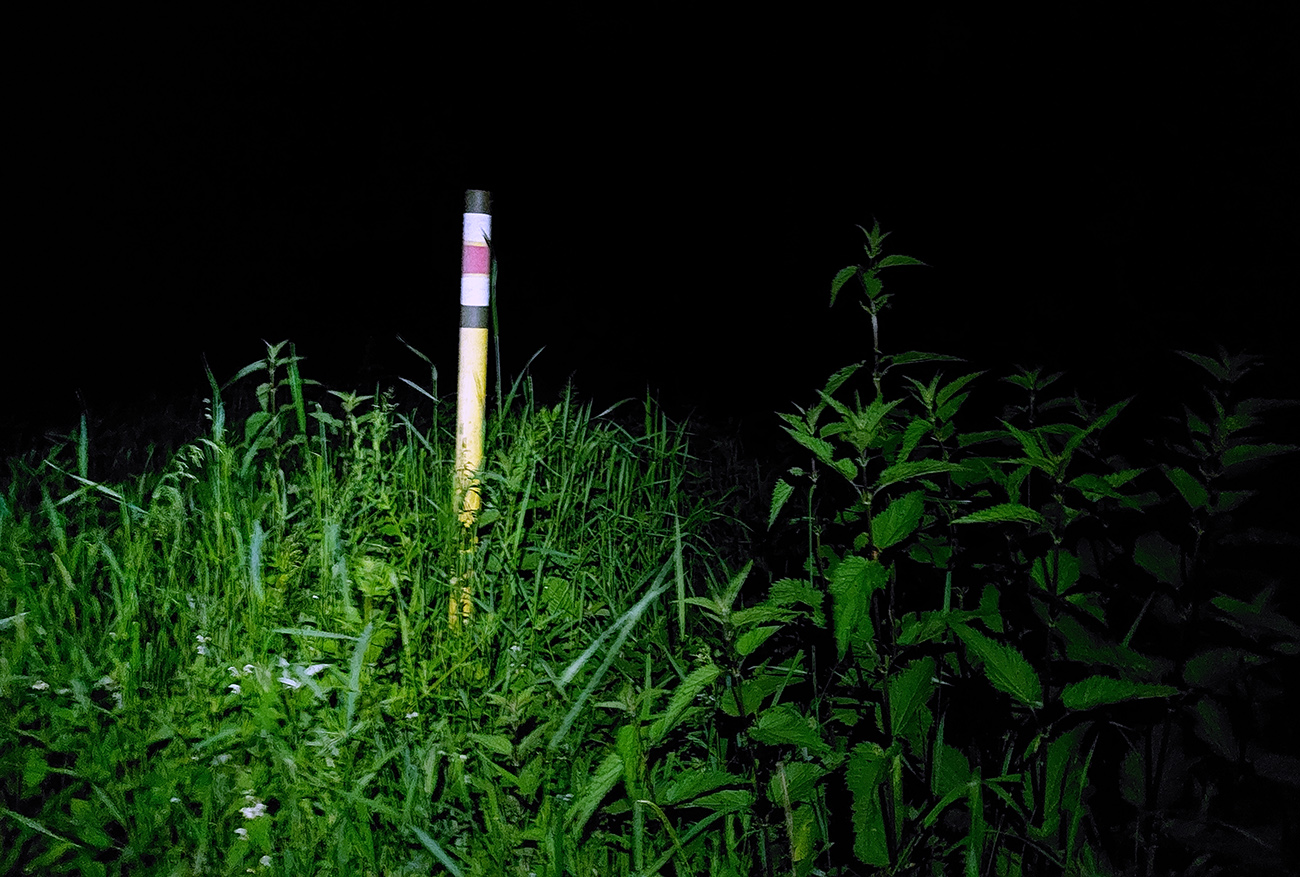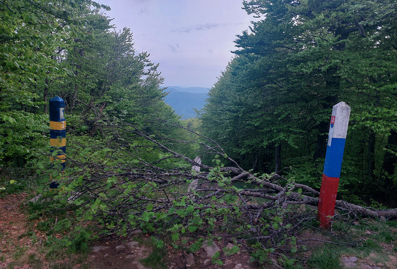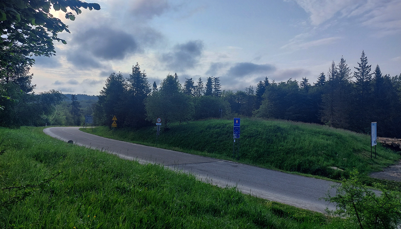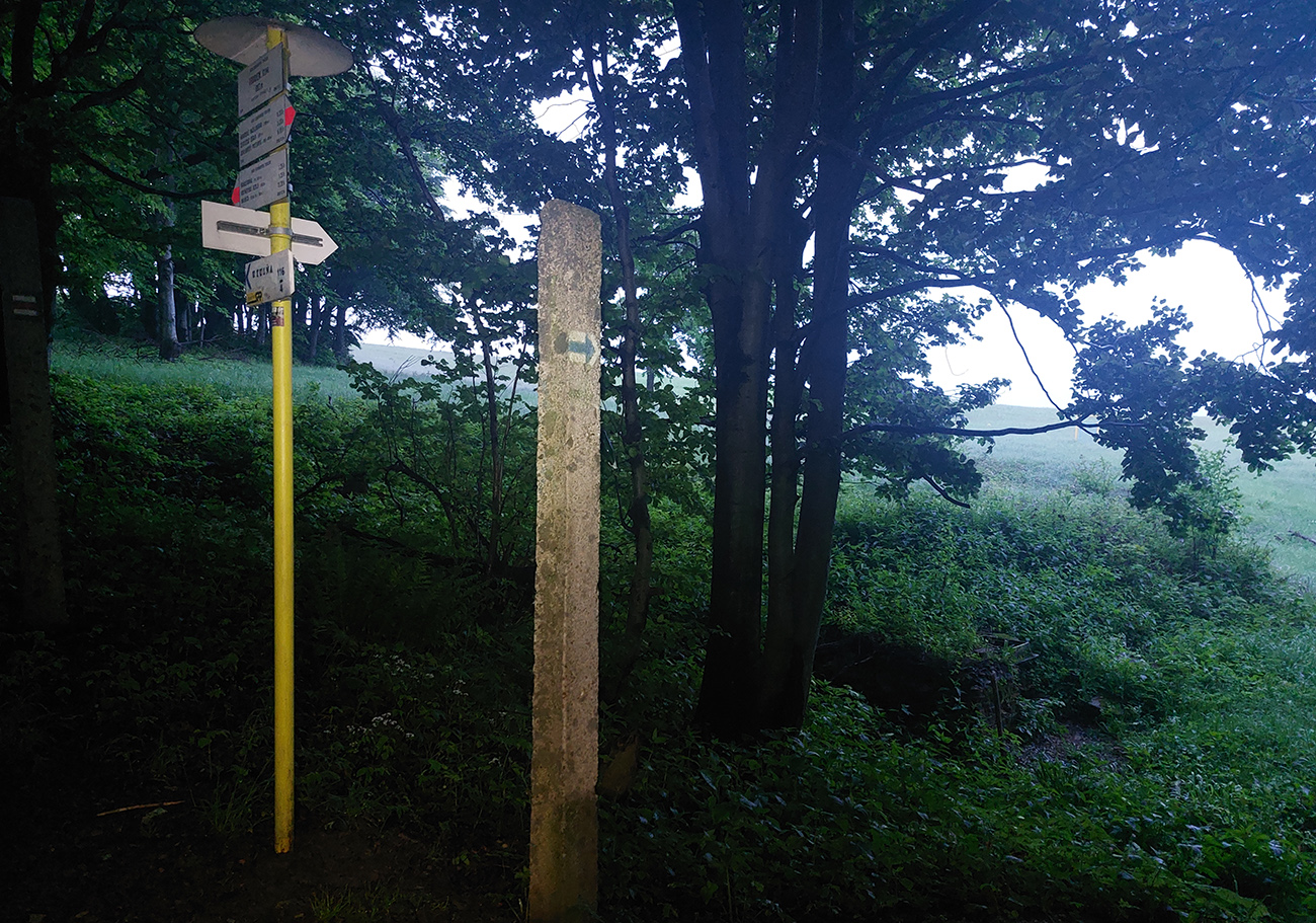 Lebo nasleduje odbočka cez potok, chvíľka na normálnej lesnej ceste a koniec srandy. Nasledujúca odbočka doprava vedie do strmého svahu, len dákym priesekom pomedzi stromy. Ten ma vypľúva na lúku a ďalej čo? Cesta nikde, tráva po pás. Smer je jasný len podľa gps, tak idem a hľadám ďalší vstup do lesa. Hovorím si „veď dobre, na mape je toto len chodník, o chvíľu sa napojí na cestu“. Hej, napojil som sa – na najhnusnejším možným spôsobom rozbitú a konármi zahádzanú zvážnicu. Na križovatkách s ďalšími podobnými „cestami“ problém, kade ísť, na lúkach hlboké stopy po traktoroch, za mostom cez Uličku naopak neexistujúce cesty a zase len prieseky medzi stromami. Značky niekde megaveľké, niekde zbytočne nahusto, inde ale chýbajú práve tam, kde ich najviac treba. Oddych pre hlavu a jednoznačnosť cesty len na kúsku starej asfaltky, kade vedie aj cyklotrasa. Potom zase divočina a až keď ma to vypľúva na spevnenú cestu dolinou potoka Kertenovatec, už som „v suchu“ - do Uble je to už len rovno za nosom, mierne z kopca. Na hranicu dorážam o štvrtej ráno a budím samozrejme pozornosť policajtov, že čože si to tam fotím. Aj im po vysvetlení trochu padajú sánky, ale nevolajú na mňa pánov s bielou kazajkou, tak pohoda.
