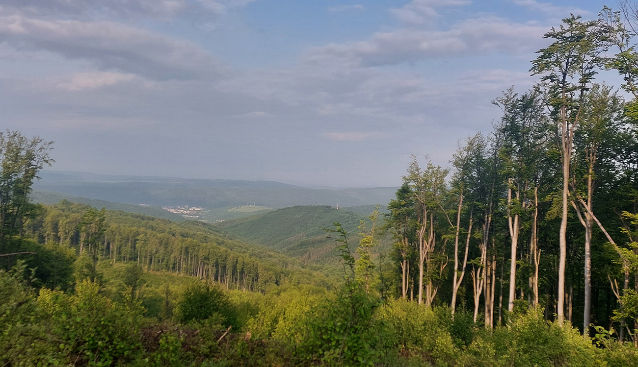Doplna dopĺňam hneď na prvom možnom mieste – pár metrov od vrcholu Kanasiówky je na mape označený pramienok a v reáli je tam aj šípka na strome. Tak idem pozrieť, čo môže tiecť tak vysoko. A ozaj, je tam! Vrchnák z bidóna poslúžil a ďalej sa mi ide znovu veselšie. Lebo v noci som veľkú spotrebu nemal, ráno je chladno a na kopcoch okolo 800 m aj zvyšky hmiel ochladzujú, spolu s tým severákom, ktorý už od včera hučí. Jeden z mála výhľadov je na Medzilaborce, tak sa skôr zabávam pohľadmi pod nohy: cez deň som sa uhýbal čiernomodrým chrobákom, v noci žabám, salamandrám a modrým slimákom – bezdomovcom. So svitaním si používatelia cesty znova vymieňajú službu. Len ja už nadsluhujem, aj ma podľa toho vypína (niekde okolo Kalinovského sedla), duklianska čokoládová eufória skončila. Až o pol siedmej slnko konečne vylieza nad mraky či nad zvyšky hmly, či čo sa to tu povaľuje, a svet a les je v ostrom svetle hneď veselší.