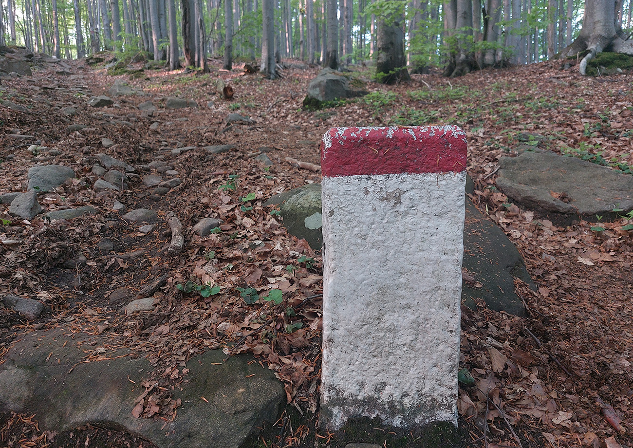Nad Obručným cez cestu a hneď sú tu prvé hraničné stĺpiky - záruka, že idem dobre. Ďalšími zárukami (až po Kremenec) sú stopy po štvorkolkách a koňoch hraničiarov a červená značka. Trojité istenie. Stĺpiky sú výborné aj na posedenie - keď mi treba dať dole batoh a niečo vybrať, pohodlne si ho prevesím cez kolená.