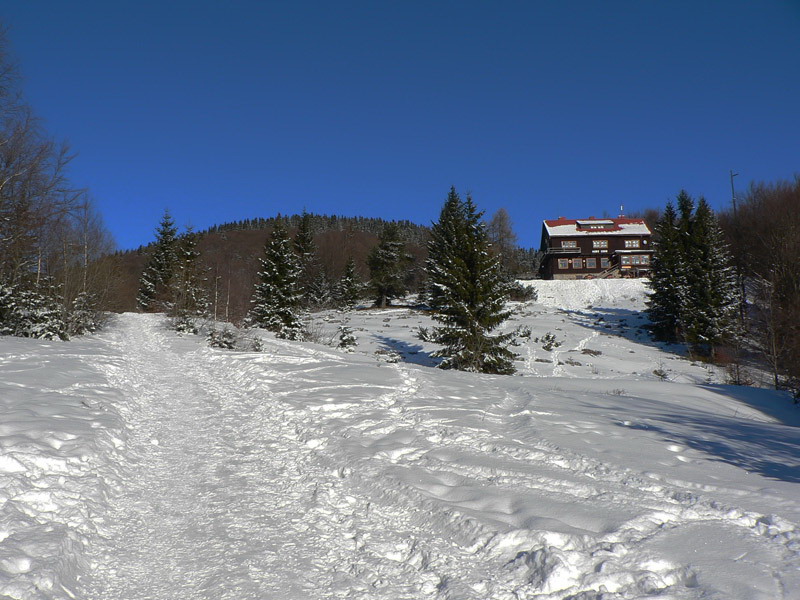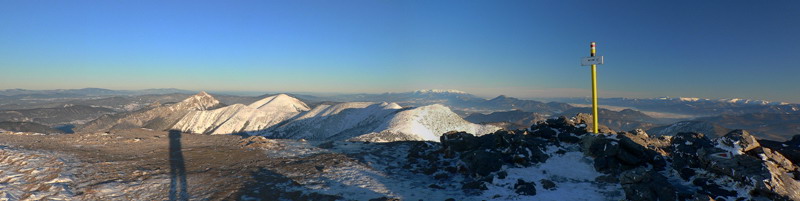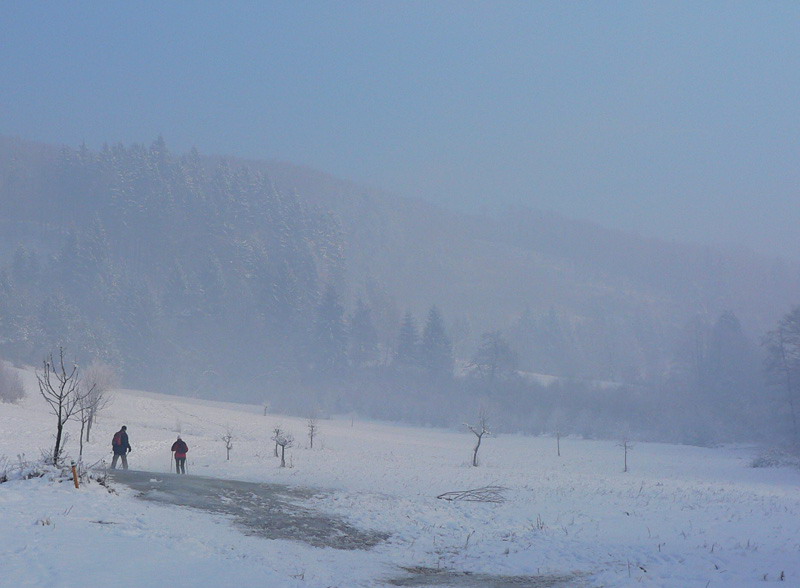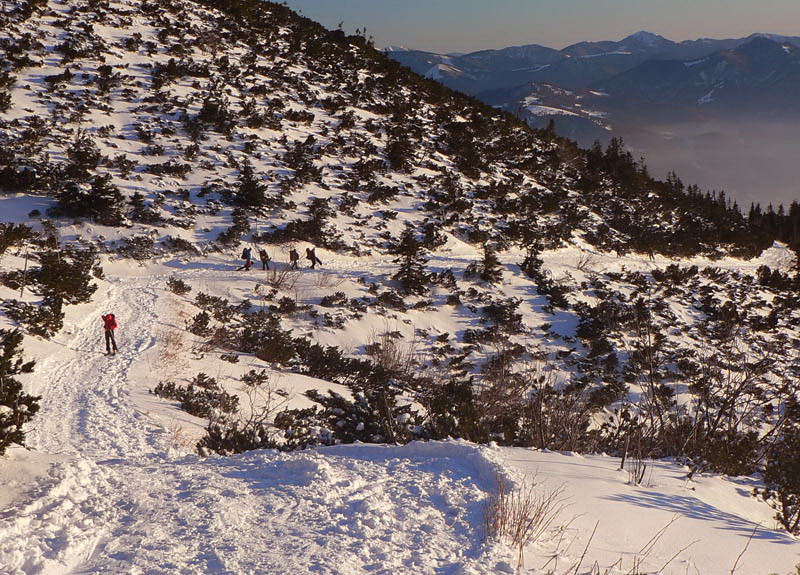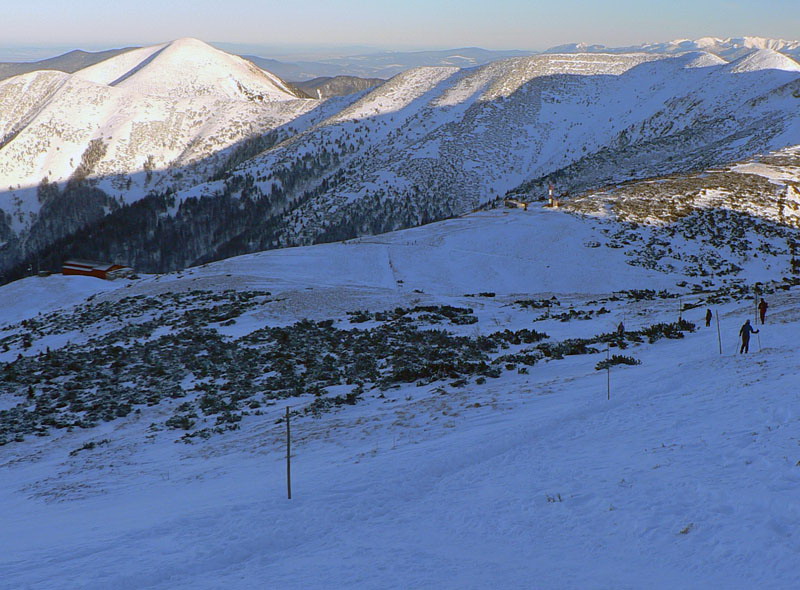 Dolu mrazivá hmla, teplota hlboko pod -10, no fuj! Už nad Kľačanmi ale presvitá modrá, takže žiadna strašná inverzia, cez deň aj do kotliny slnko nakukne. Stúpanie na chatu pod Kľačianskou Magurou je pekne na juh a pekne strmé, navyše bez vetra, veď čo by som chcel pri inverzii? Zhadzujem jednu vrstvu po druhej až po tričko. Na pásoch by sa to dalo s trochou opatrnosti možno od Dlhej lúky, smerom dolu ale isto nie. Pre pešiaka je však chodník ideálny, predupaná diaľnica až do sedla pod Suchým, zmrznutý sneh výborne drží, nepodklzuje. Toto bude platiť na väčšine dnešnej trasy – kráča sa pohodlnejšie ako v lete. Aj ľudí je tu skoro ako v lete.