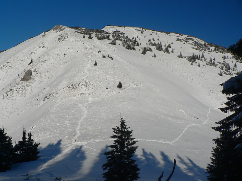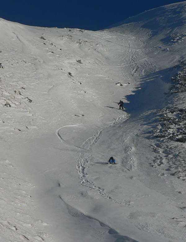 Pod Malým Kriváňom dvaja nadšenci (lyže a snowboard) skúšajú malú muldu pri chodníku, ale tie zvuky spod hrán patria skôr k hokeju... Na pásy je tu na chodníku všade primálo snehu, v muldách zas priveľa ľadu. S úžasom o to väčším preto sledujem pomerne čerstvé stopy od pásov pod Veľkým Kriváňom, ich autor sa musel k smrti „ukľučkovať“ pomedzi šutre. Že toto niekoho baví... Z vrcholu do Snilovského sedla schádza zopár ľudí, sklamane nesú krikľavo farebné klzáky, skúšajú to aspoň na kúsku, ale na takomto zmrznutom podklade sa ani nešmýka! No mne to vôôôôbec nevadí, len by mohlo trochu menej duť, aby som bol po troch fotkách ešte schopný stlačiť spúšť. No nestlačím! Takže rýchlo preč do závetria, smer Snilovské sedlo. Tam je tradične husto, ľudia sa hemžia všetkými smermi, najviac ich je v traverze k chate pod Chlebom. To je teraz asi jediná (pre sklznice) bezpečná cesta v oboch smeroch. Cestou na chatu vidím, že aj východná krivánska mulda je husto počmáraná lyžami – je tam v závetrí predsa aspoň trochu prašanu.