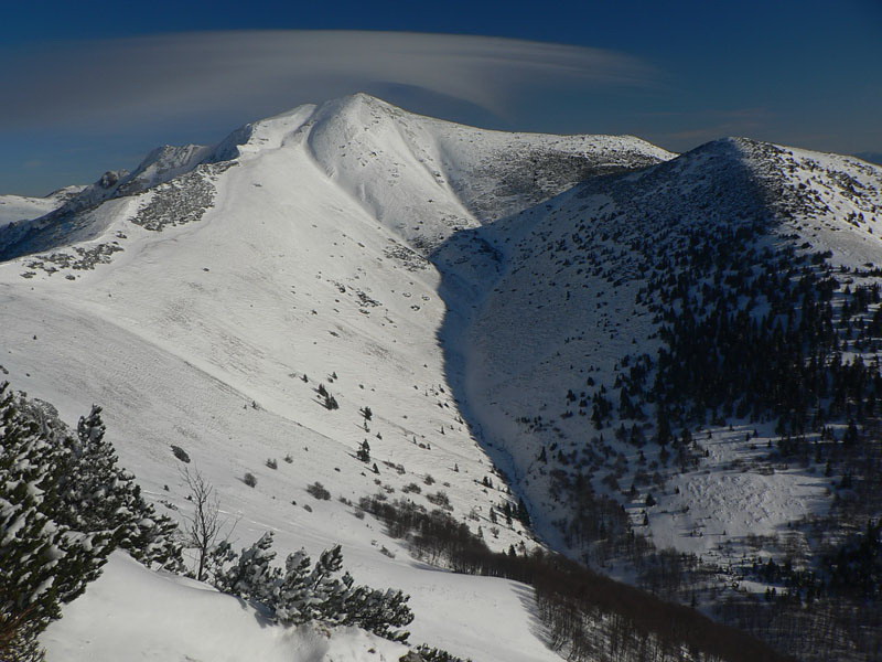 Na Suchý sa už ide zo sedla horšie, čerstvý sneh nemá podklad, len trávu, tak sa ani schodíky nedajú veľmi vydupávať na tejto „streche“ a je tu dosť odtlačkov turistických zadkov - takých „statických“ aj „dynamických“, niekoľkometrových :-) Poriadne fučí, ale od severozápadu, takže na zvyšku cesty do chrbta, nevadí. Na pásoch sa dá komfortne prejsť od chaty až pod Suchý, aj traverz ďalej do sedla Priehyb sa dá – z hrebeňa odhadujem, že v oboch smeroch.