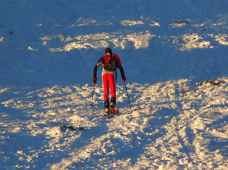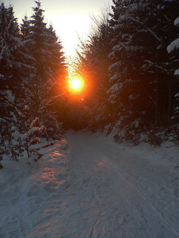 Klesajúce slnko pridáva odtiene červenej - je to síce pekné, ale treba frčať dolu Generálom. Ten je už v pohode lyžovateľný aj šliapateľný, ani bez lyží sa neprepadávam do čučoriedia. Len široká stopa a nahusto porozhadzované nepríjemné ľadové hrče ukazujú, že sa tadeto nedávno prehnal ratrak. Slnko zapadá, stmieva sa a dolu v lese to iskrí ako na Silvestra – niekoľko šialencov si dokazuje, že aj po kameňoch sa dá na lyžiach, hmmm. Na odbočke na skratku si našťastie dajú povedať a na Zajacovú idú po ceste. Ale aj tam sa za nimi trochu iskrí :-)
