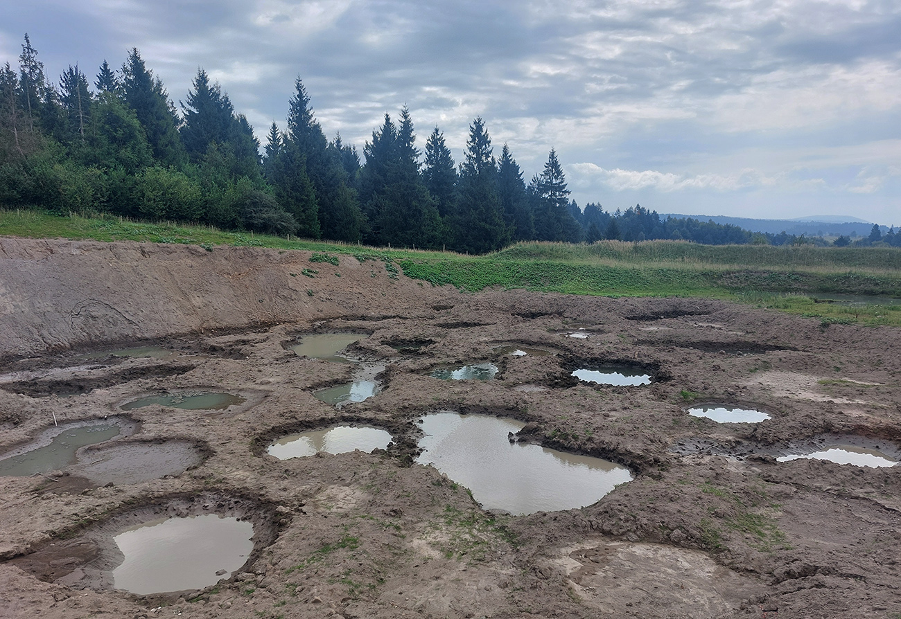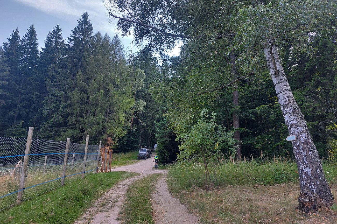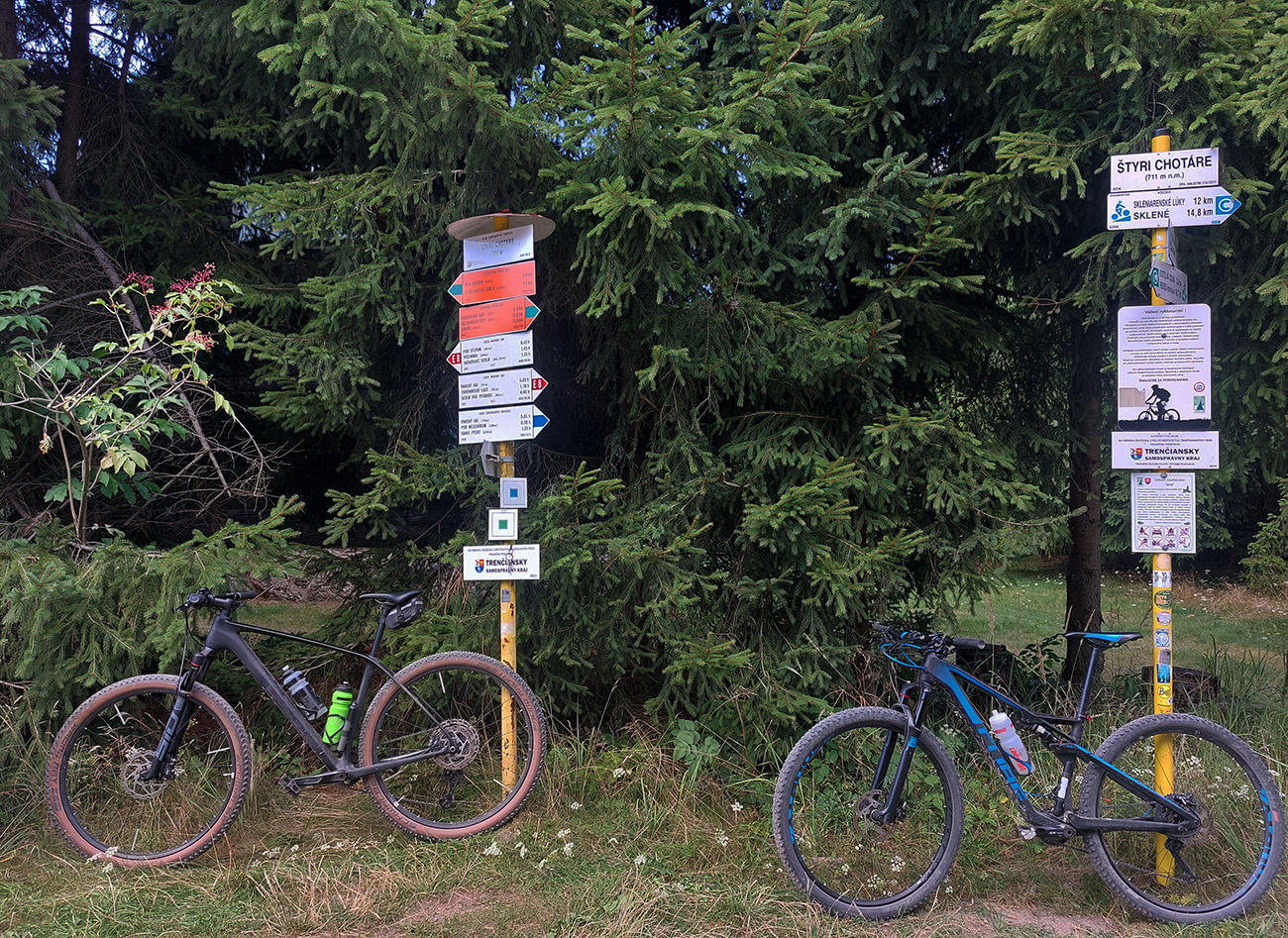 V postupe na sever nás zastavil až čas a smerovník na spoji našej modrej cyklotrasy so zelenou (Žiarska radiála, č. 5318), stúpajúcou na „hrebeň“ na Štyri chotáre. Tak sme ju využili a po vyše šiestich kilákoch mierneho stúpania (dole asfalt, vyššie šotolina) sme sa ocitli pri šípkami naježených smerovníkoch – a že teda čo ďalej. Lebo pod kolesami ani nie prach, ale púder, kopy dreva, nič moc estetika prostredia. A taký mám zafixovaný skoro celý hrebeň tejto južnejšej polovice Žiaru.