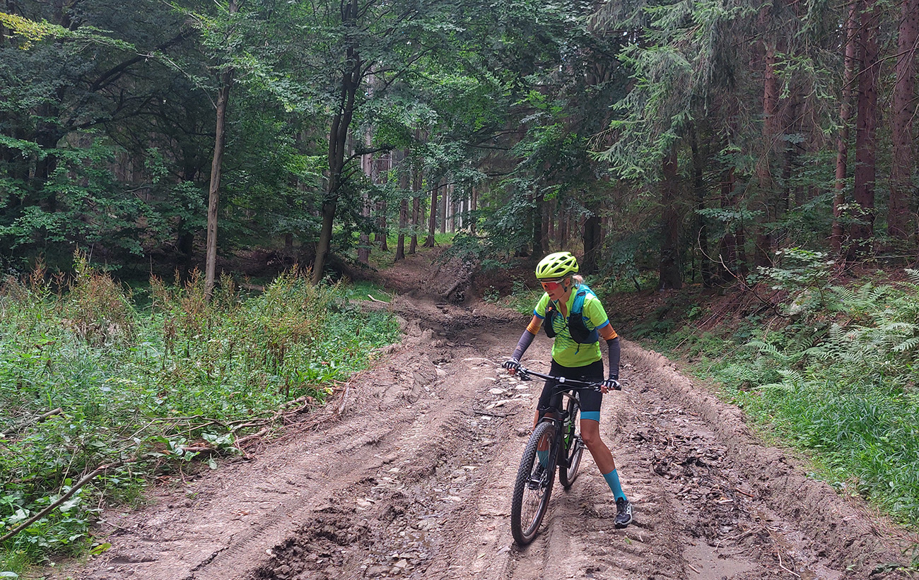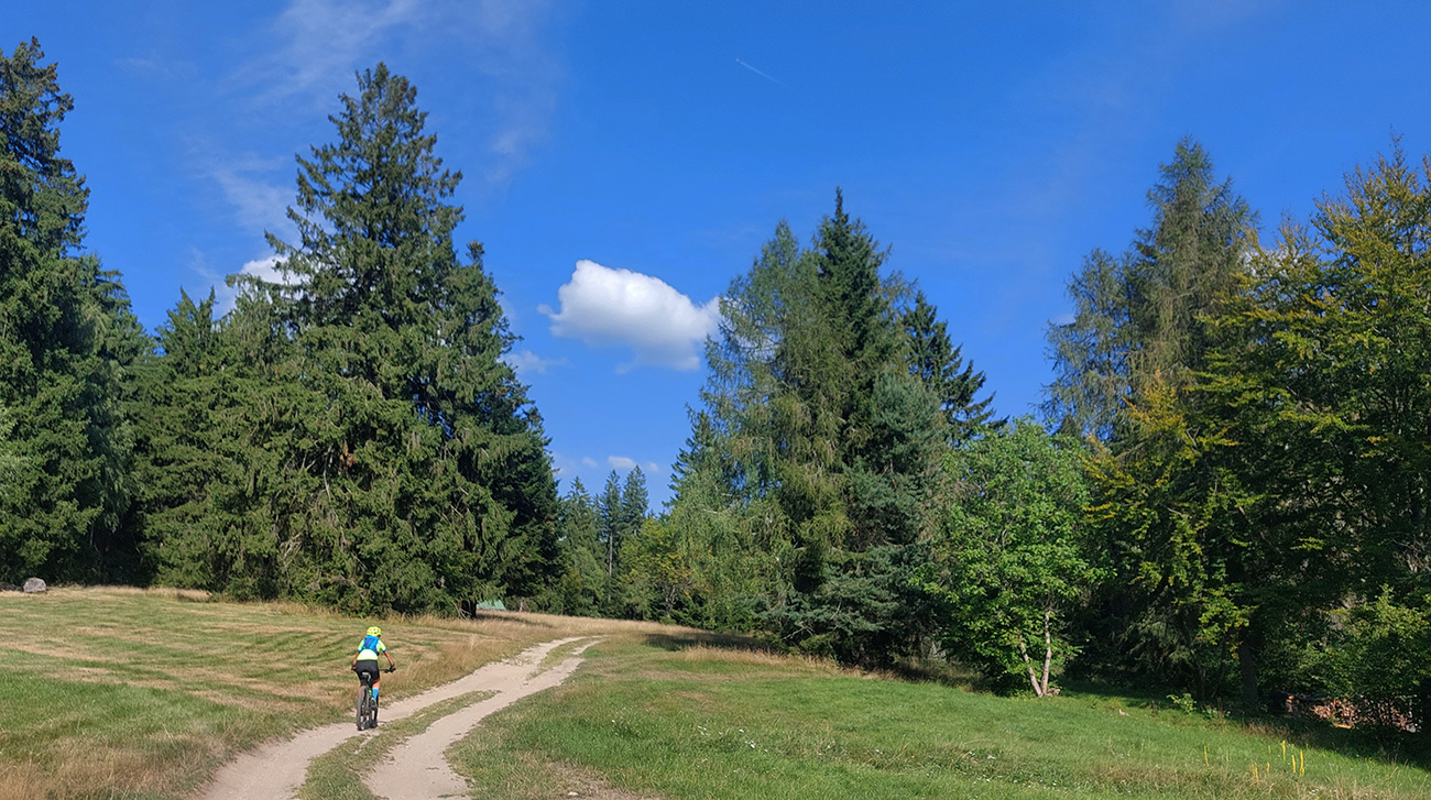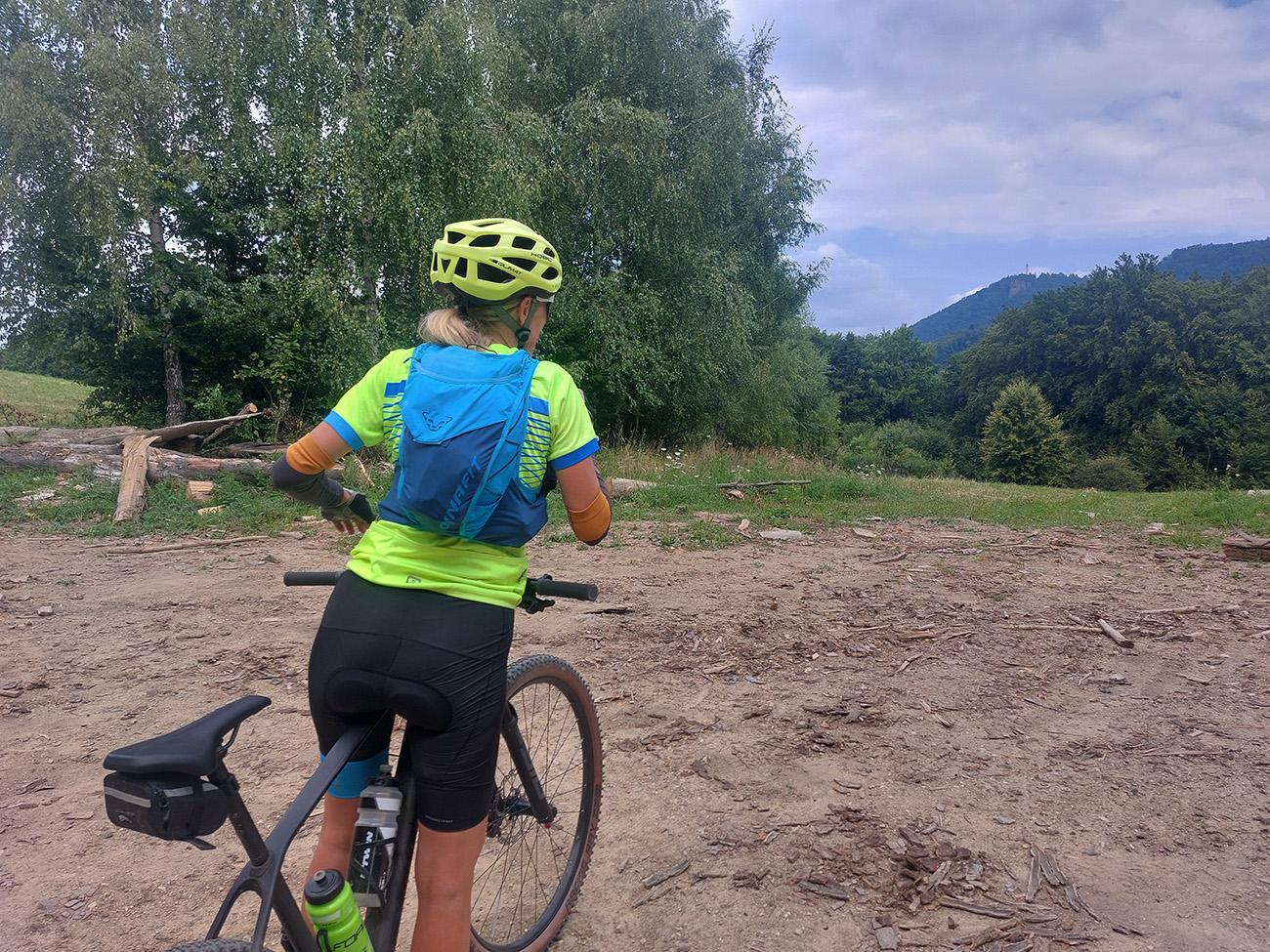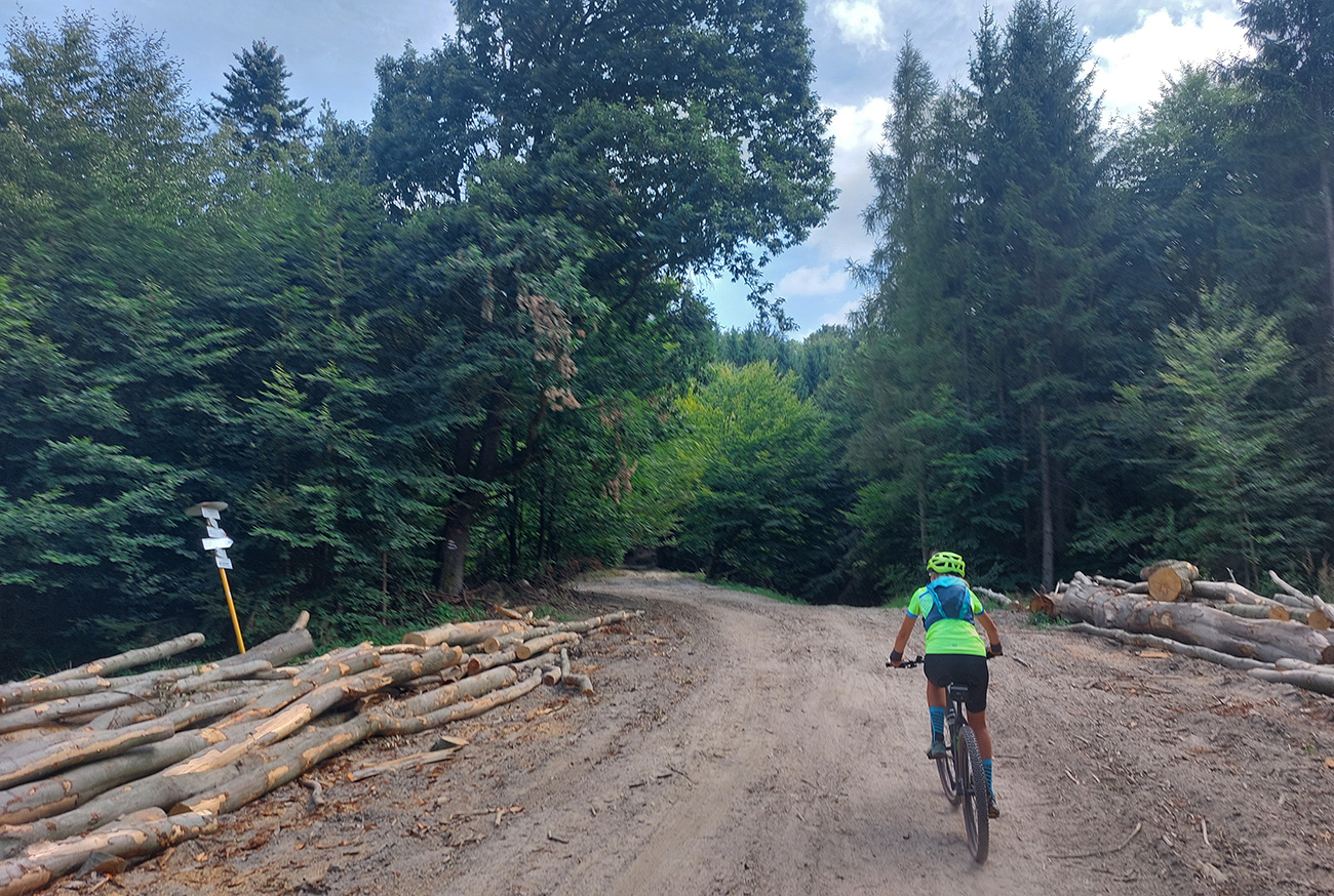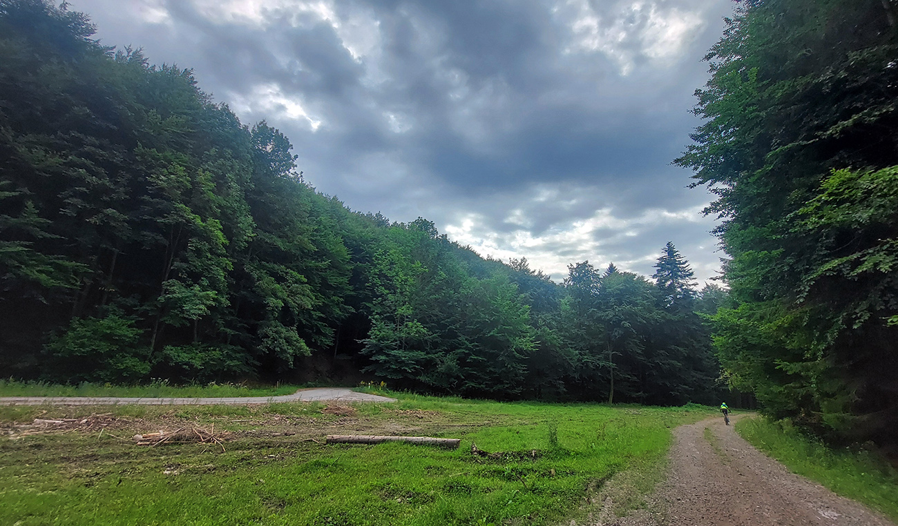 Znovu sa objavila požiadavka na „sprievodcovské služby“, a zároveň bolo treba zvoliť lokalitu, ktorú svojimi búrkami nezasiahne a nezamočí prechádzajúci front. Takže padla voľba na južnú časť Žiaru medzi Turčianskymi Teplicami a Handlovou, kde je na mrte pevných (aj asfaltových) lesných ciest a už ten kút máme tu na Vetromagu viackrát zreportovaný (odkazy sú dole). Technicky to nie je náročné jazdenie, zato ale ani výhľadov nie je veľa, väčšinou sa ide lesom. No také príjemné je to, že sa môžu dvaja vedľa seba v pohode vykecávať za jazdy. Naklikal som nejakých 90 km s možnosťami predĺženia aj skrátenia, ale vďaka frontu sme začali trochu neskôr, tak sme mierne upravovali. Na vzdialenosti sa to však takmer neprejavilo. Jednou zo zásadných vecí na trase bol prieskum „použiteľnosti“ spojky medzi východnými (nad Kunešovom) a západnými traverzami (ponad Handlovú), cez sedielko medzi Havraňou skalou (864 m) a Vysokou horou (909 m). Spojka pobiede použiteľná, o tom viac nižšie, takto to celé dopadlo, so začiatkom a cieľom v TT: