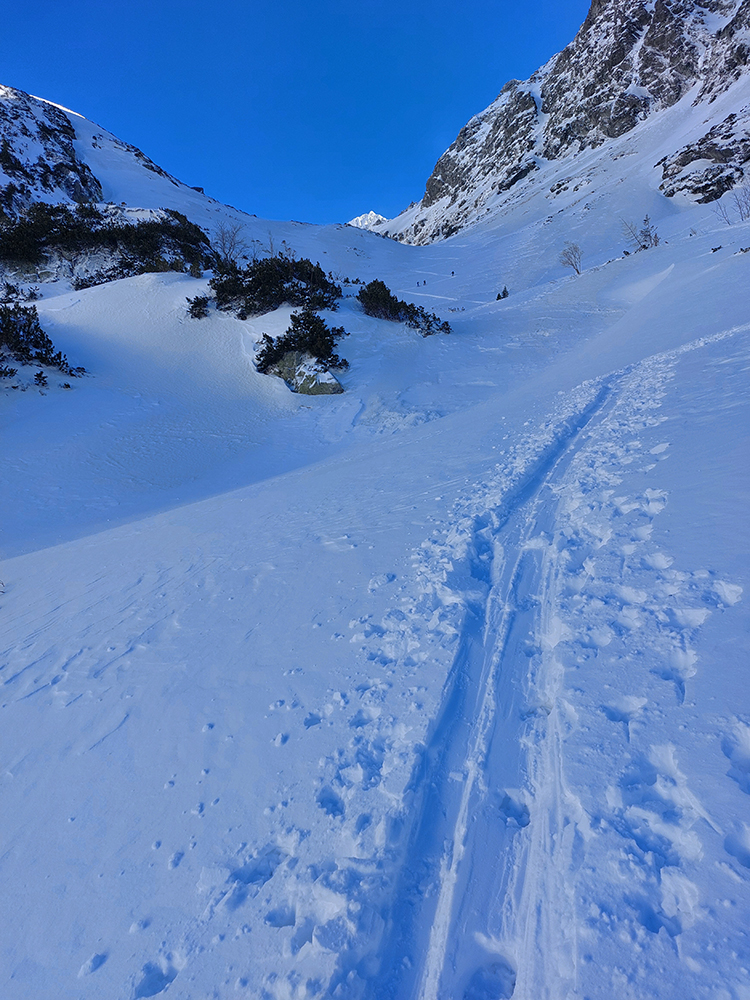 Pešovali sme od električky, v druhej polovici cesty by sa po tom čerstvom centimetri aj hádam opatrne dalo pásovať, ale obuli sme až za chatou, pri Popradskom plese. Úvod až pod Ľadové pleso: na zmrznutom špinavobielom firne žiarivo biely, lebo čerstvý povlak, pár cm vetrom ubitého, suchého a hutného snehu. Príjemný vetrík do chrbta a jednoznačne vyšliapaný smer.