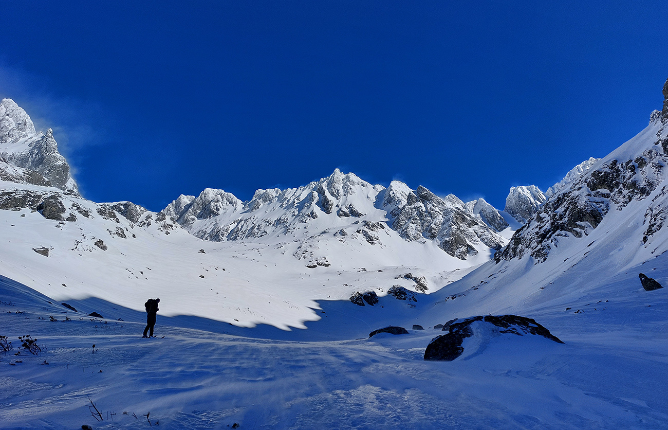 Na hrane pod Zlomiskovou vežou akoby sme vošli do sopečnej krajiny – tak sa z vrcholkov naokolo „dymilo“. To tam víchor víril snehy a posielal ich na východ. V doline ale pohoda a keď, tak len jemné potlačenie do chrbta. Nad hlavami azúro neskutočné, no pohľad vpred, do Železnej brány, ukazoval v nej poriadnu metelicu.