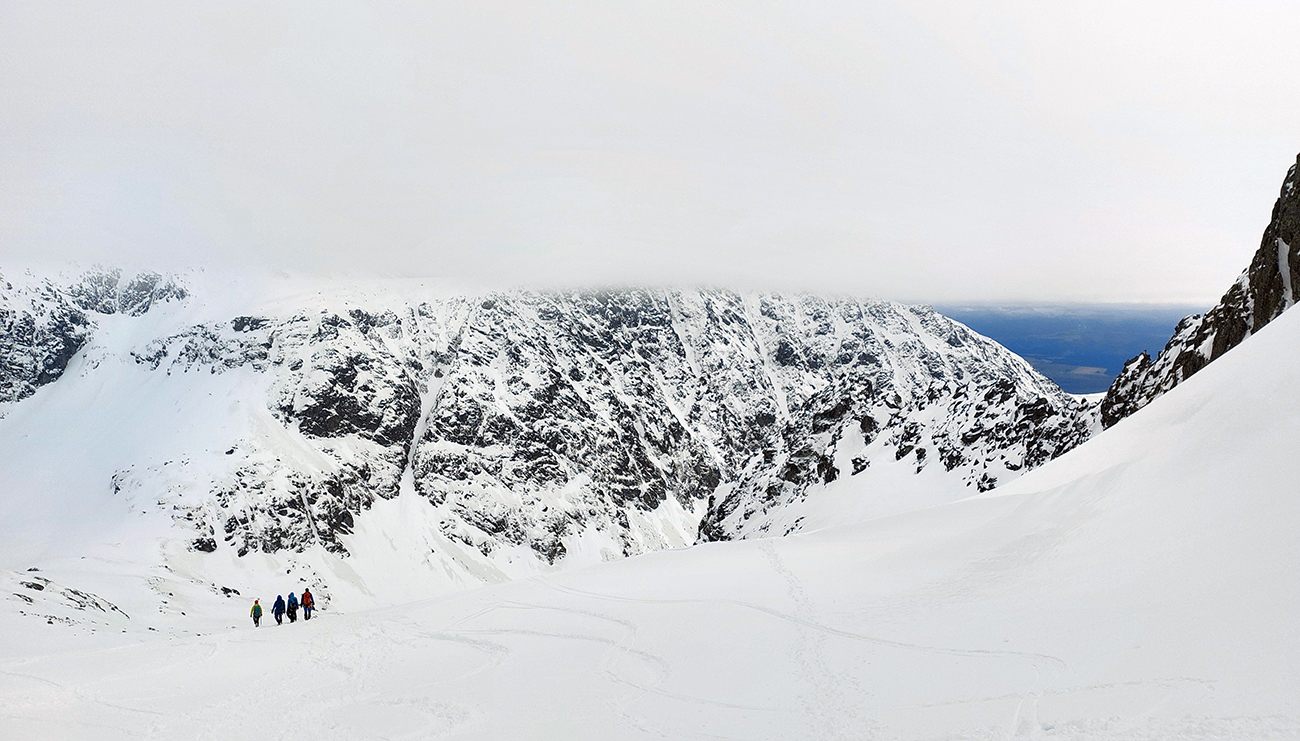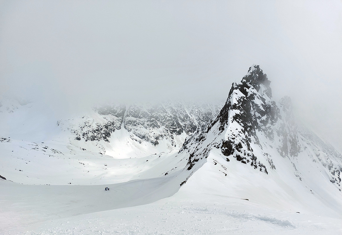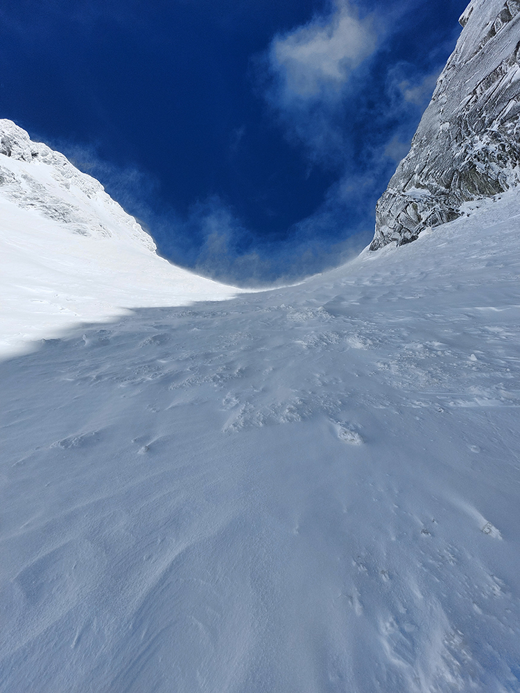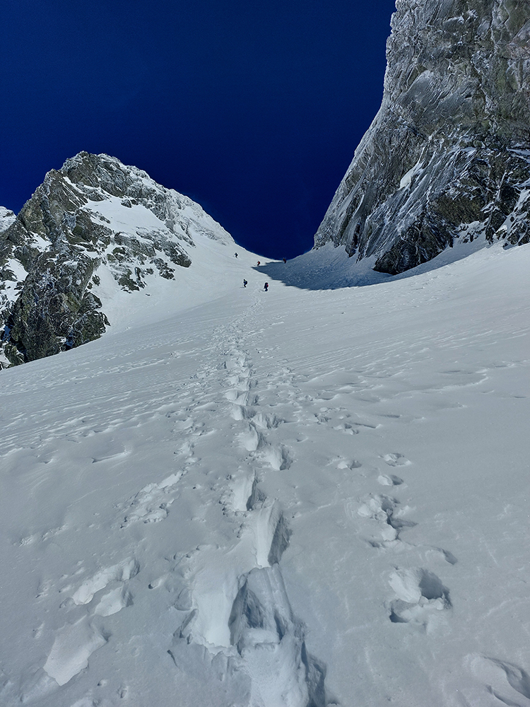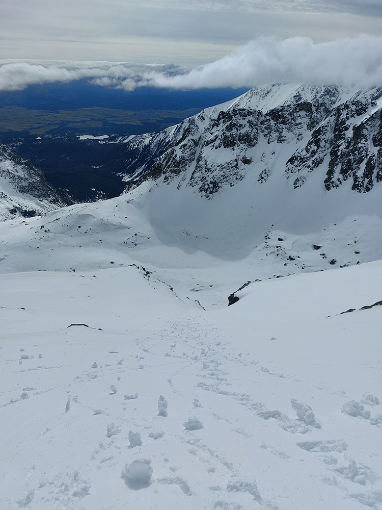 Aj tak bolo: schodíky sme síce už mali, ale hore boli víchrom zaviate, ani mačky sa do toho ľadu miestami moc nechceli zasekávať. Posledné metre pekne po špičkách. Hore prevej, za ním neviditeľno, ako tam nárazy uragánu vírili sneh. V ich prestávkach sa zdola škeril čerstvo načechraný a poriadne veľký vankúš – no neodvážil by som sa tam nalyžovať.